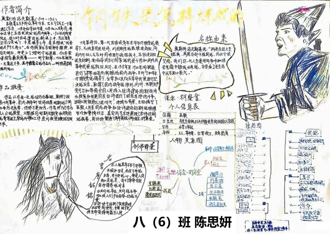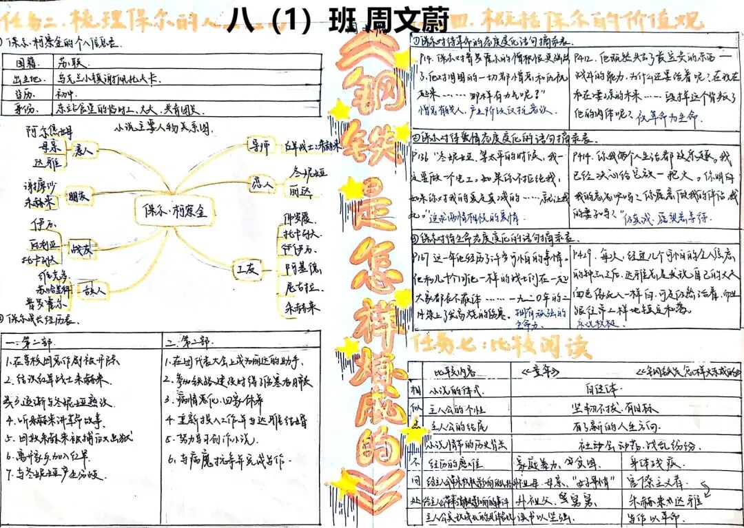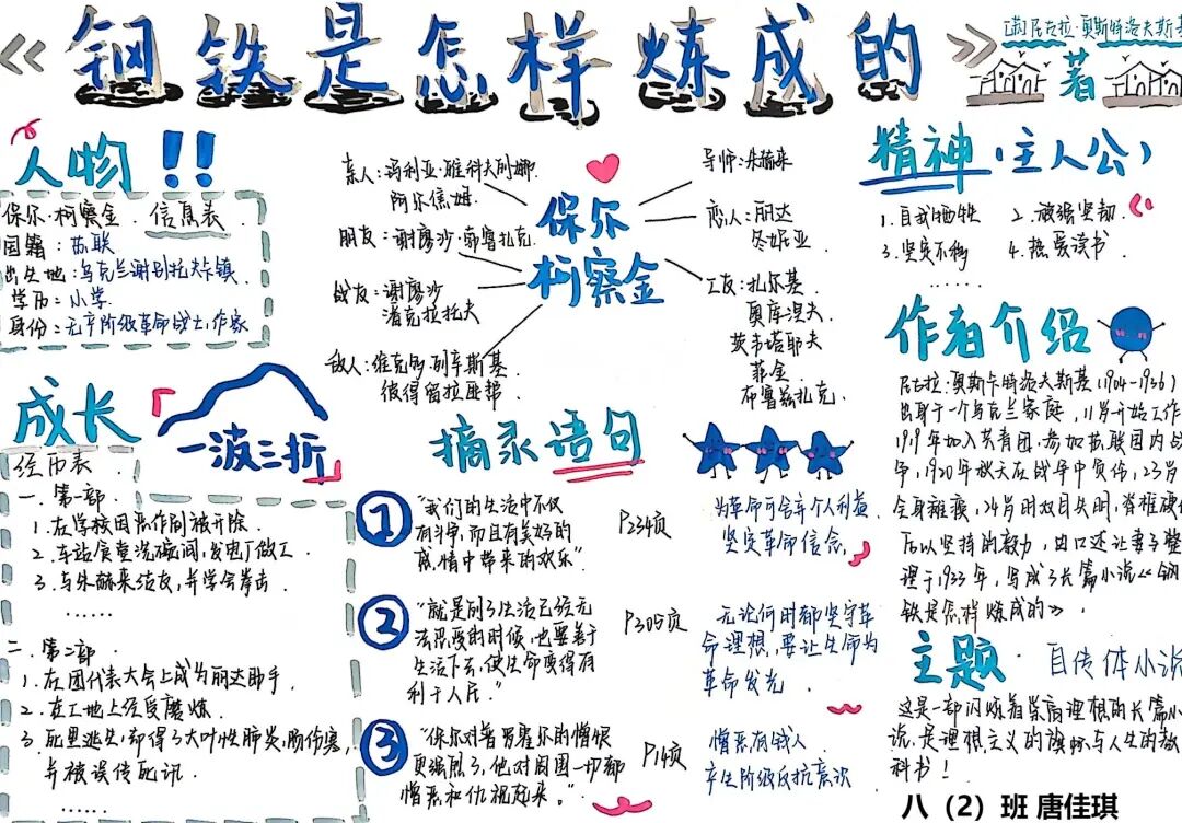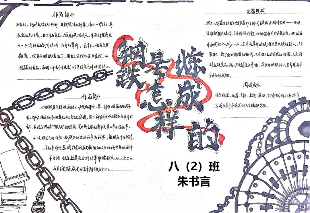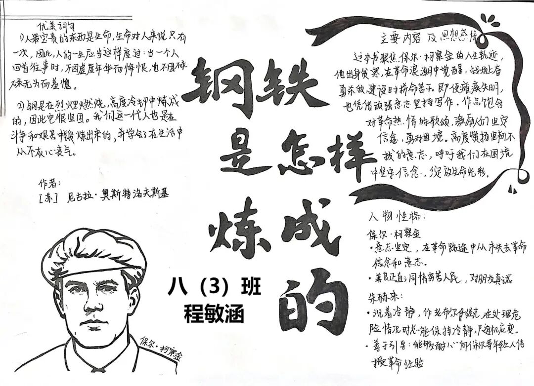 严冬蕴春意,书香暖寒窗。我校八年级语文备课组以"经典润心·淬炼思想"为主旨,精心策划《钢铁是怎样炼成的》《经典常谈》名著研习活动。二百余学子执卷凝思,以笔墨丹青为舟楫,在时光的长河里完成了一场深度阅读的精神远航。 八年级备课组将经典文学转化为可感可触的阅读体验,教师们研精覃思,编纂《名著手抄报制作指南》。如在《<钢铁是怎样炼成的>手抄报制作指南》中,设计了“历史大事年表梳理”“保尔人生经历梳理”“保尔人物形象特征梳理”“保尔人生价值观概括”“名言座右铭摘录”“保尔人物小传撰写”“名著比较阅读”七个学习任务;在《<经典常谈>手抄报制作指南》中,设计了“经典文学常识梳理”“经典迁移理解”两个学习任务。 当稚嫩的笔触与深邃的思想相遇,当传统的翰墨与创新的设计交融,这场跨越时空的经典对话,终在少年心中铸就精神的丰碑。 《经典常谈》小报精选