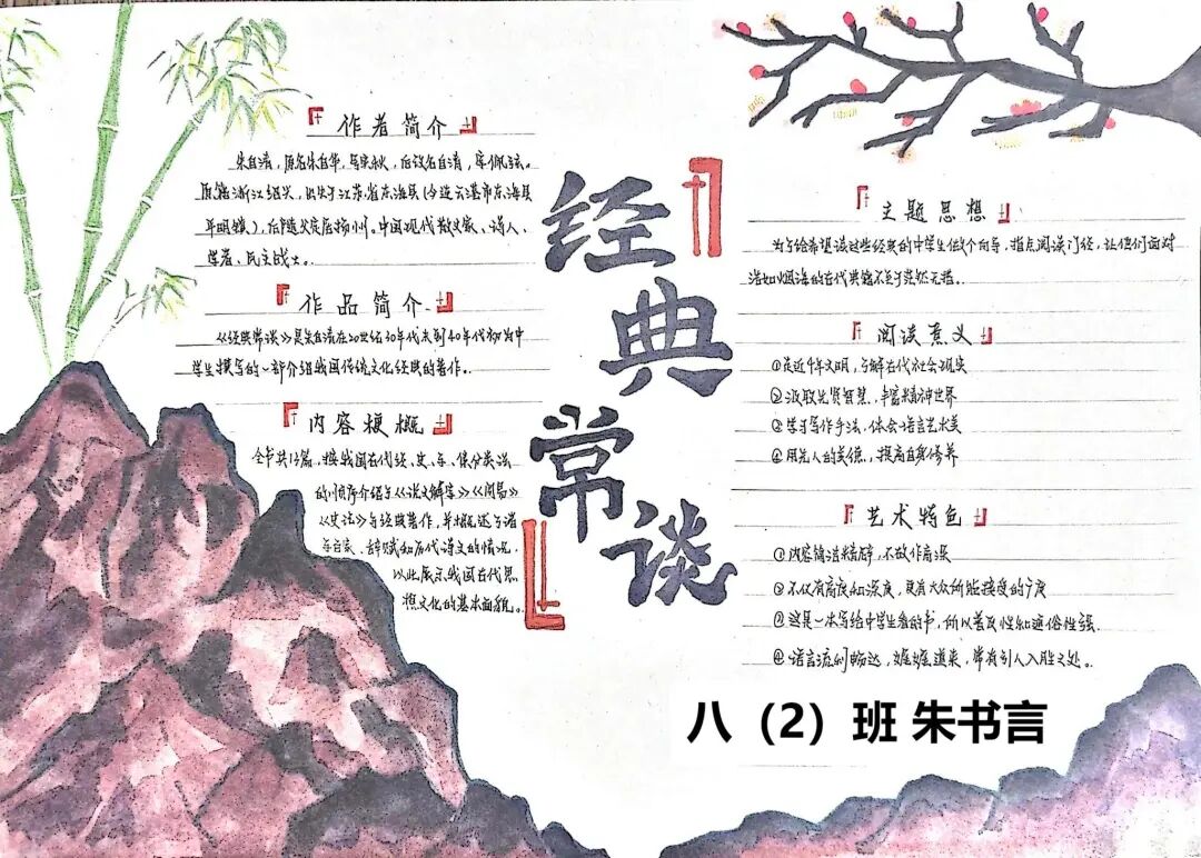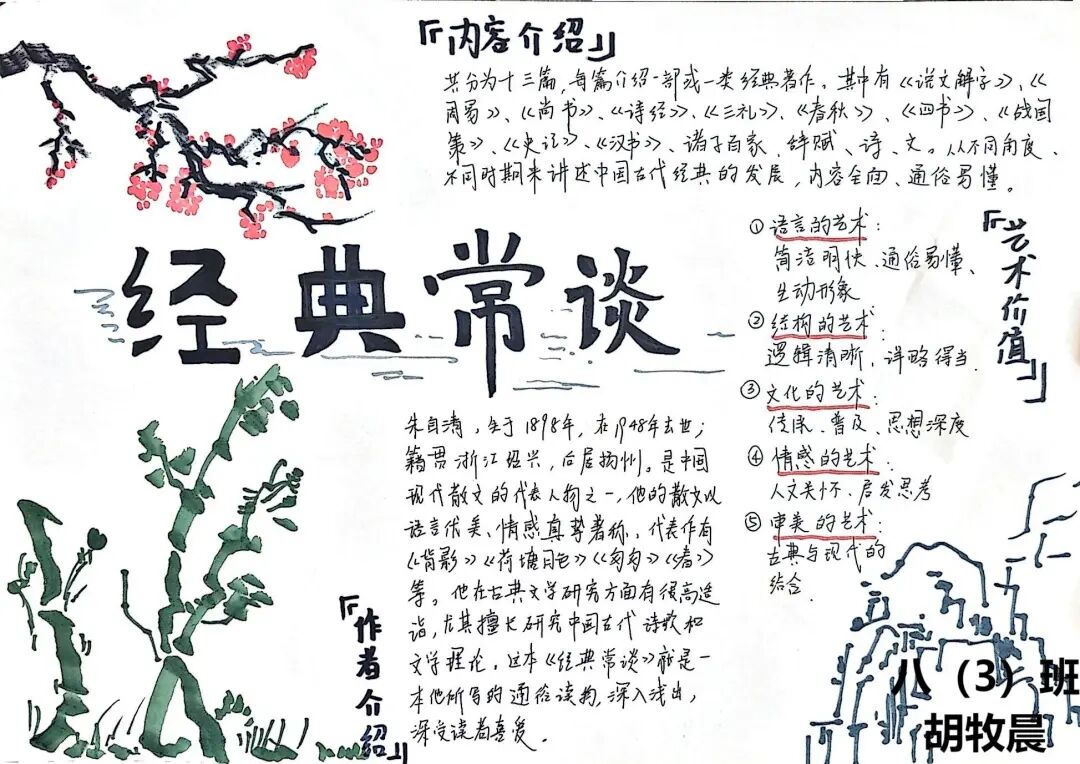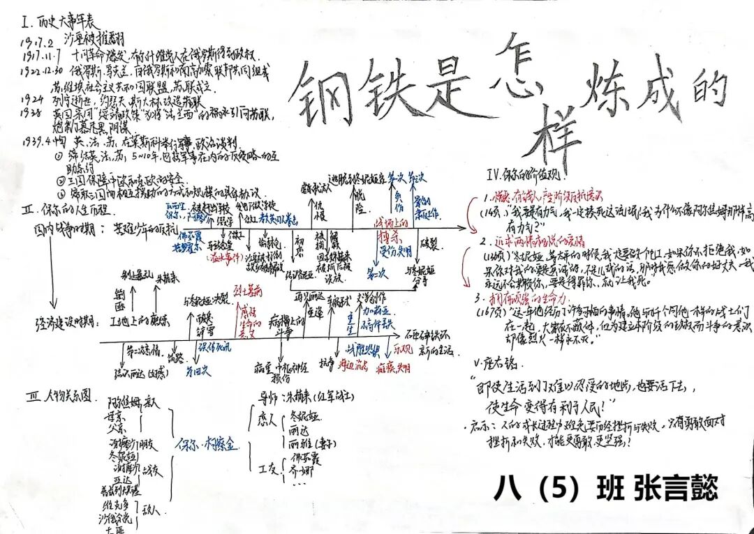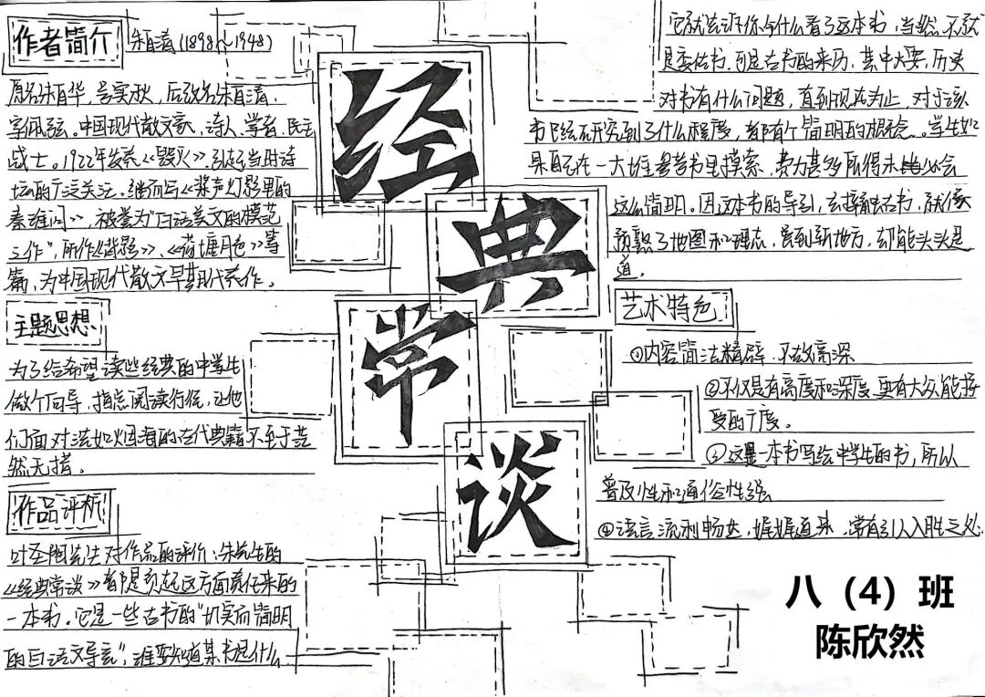 严冬蕴春意,书香暖寒窗。我校八年级语文备课组以"经典润心·淬炼思想"为主旨,精心策划《钢铁是怎样炼成的》《经典常谈》名著研习活动。二百余学子执卷凝思,以笔墨丹青为舟楫,在时光的长河里完成了一场深度阅读的精神远航。 八年级备课组将经典文学转化为可感可触的阅读体验,教师们研精覃思,编纂《名著手抄报制作指南》。如在《<钢铁是怎样炼成的>手抄报制作指南》中,设计了“历史大事年表梳理”“保尔人生经历梳理”“保尔人物形象特征梳理”“保尔人生价值观概括”“名言座右铭摘录”“保尔人物小传撰写”“名著比较阅读”七个学习任务;在《<经典常谈>手抄报制作指南》中,设计了“经典文学常识梳理”“经典迁移理解”两个学习任务。 当稚嫩的笔触与深邃的思想相遇,当传统的翰墨与创新的设计交融,这场跨越时空的经典对话,终在少年心中铸就精神的丰碑。 《经典常谈》小报精选