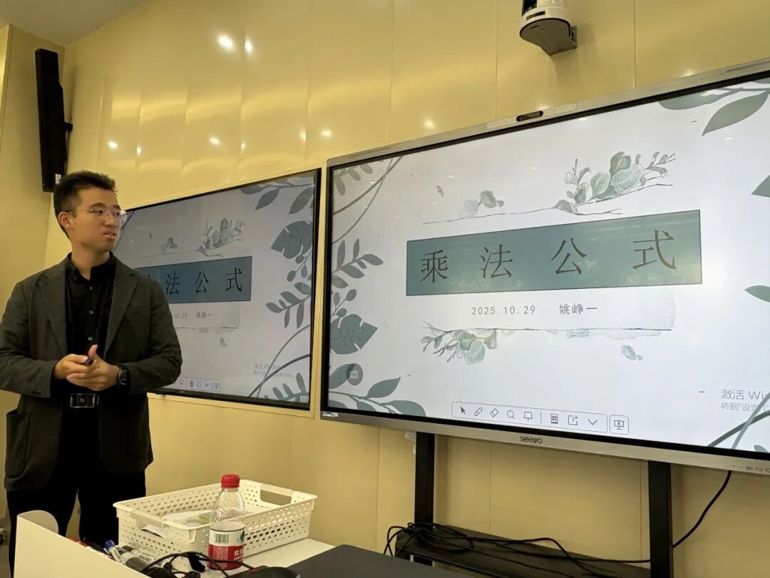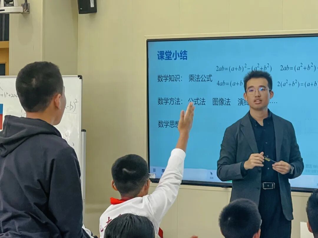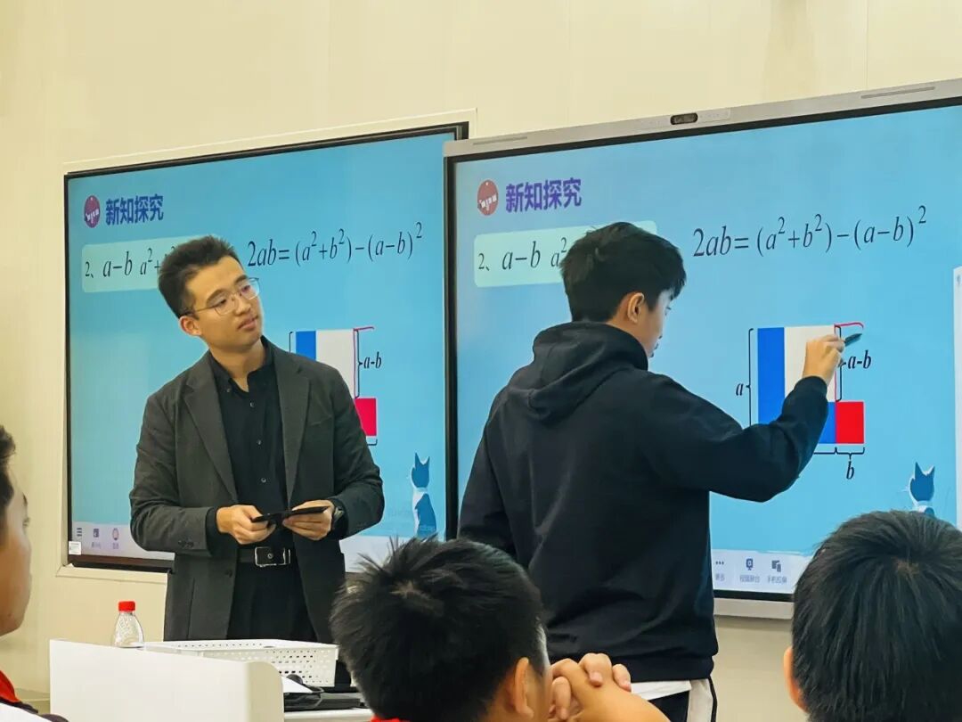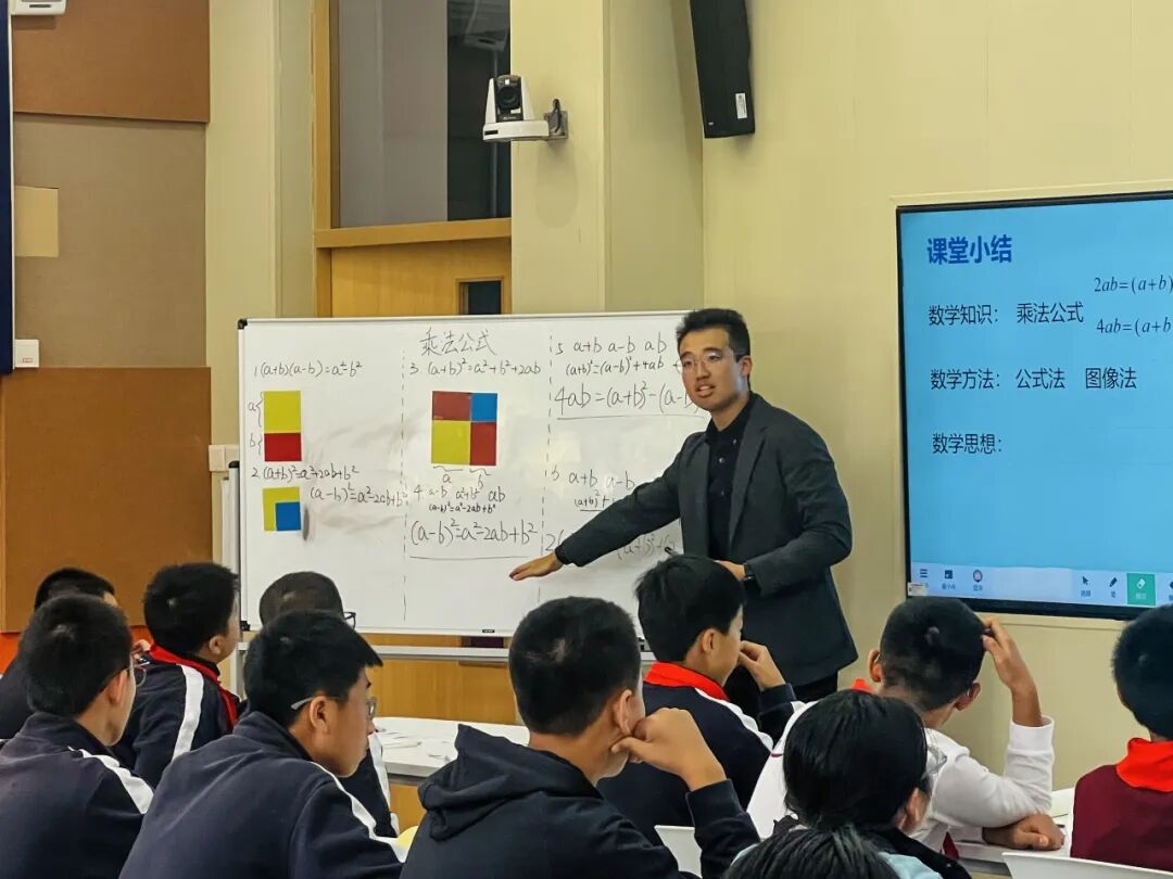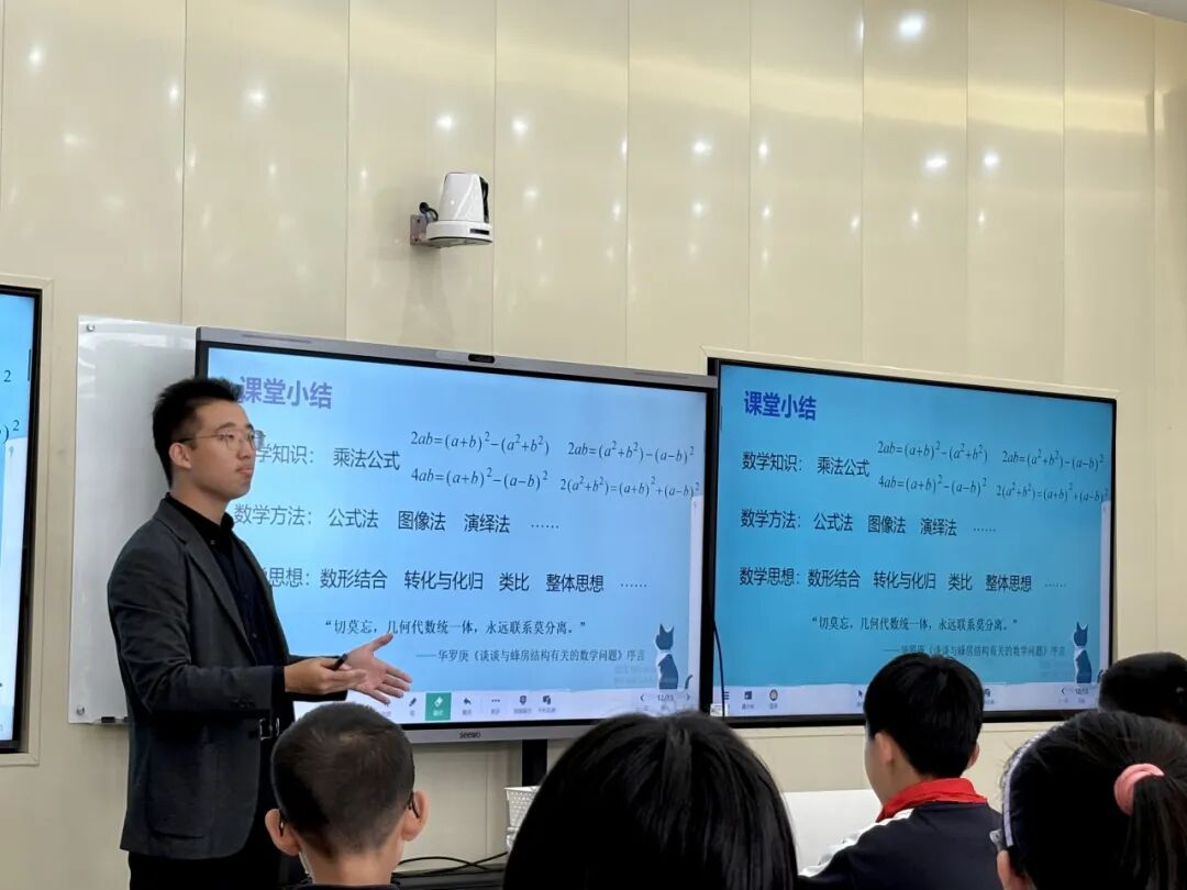 展示环节 本次公开课展示由姚峥一老师带来,课题为《11.2(4)乘法公式》。他以留白创造式教学理念为核心,结合具体问题,引导学生观察公式,探寻其中的共同点,发现代数式之间的内在联系,充分展现了“发现之白”。 在教学过程中,姚老师借助多样化的教学手段,助力学生结合图形模型(如面积拼接)开展自主研究,阐释公式的几何意义,生动呈现了“方法之白、论证之白”。学生们在经历运用图像与代数方法推导公式的过程中,能够准确运用符号语言书写公式。在合作探究环节,学生们清晰地陈述自己的发现与思路,运用数学语言交流观点,有效提升了表达与沟通能力,这便是“陈述之白”的体现。 通过图形验证与代数推导的双向建构,学生们深化了数形结合思想,增强了代数直觉。他们能够类比已有知识去探索新知,培养了类比、转化与化归等数学思想方法,逐步形成结构化的认知网络。课程最后进行总结,从知识与方法层面出发,超越知识本身,指向思想和精神目标,完美展现了“超越之白”。 姚老师深度理解挖掘教材,充分展现了其在新课标理念下提升学生核心素养、培养数学高阶思维的能力。