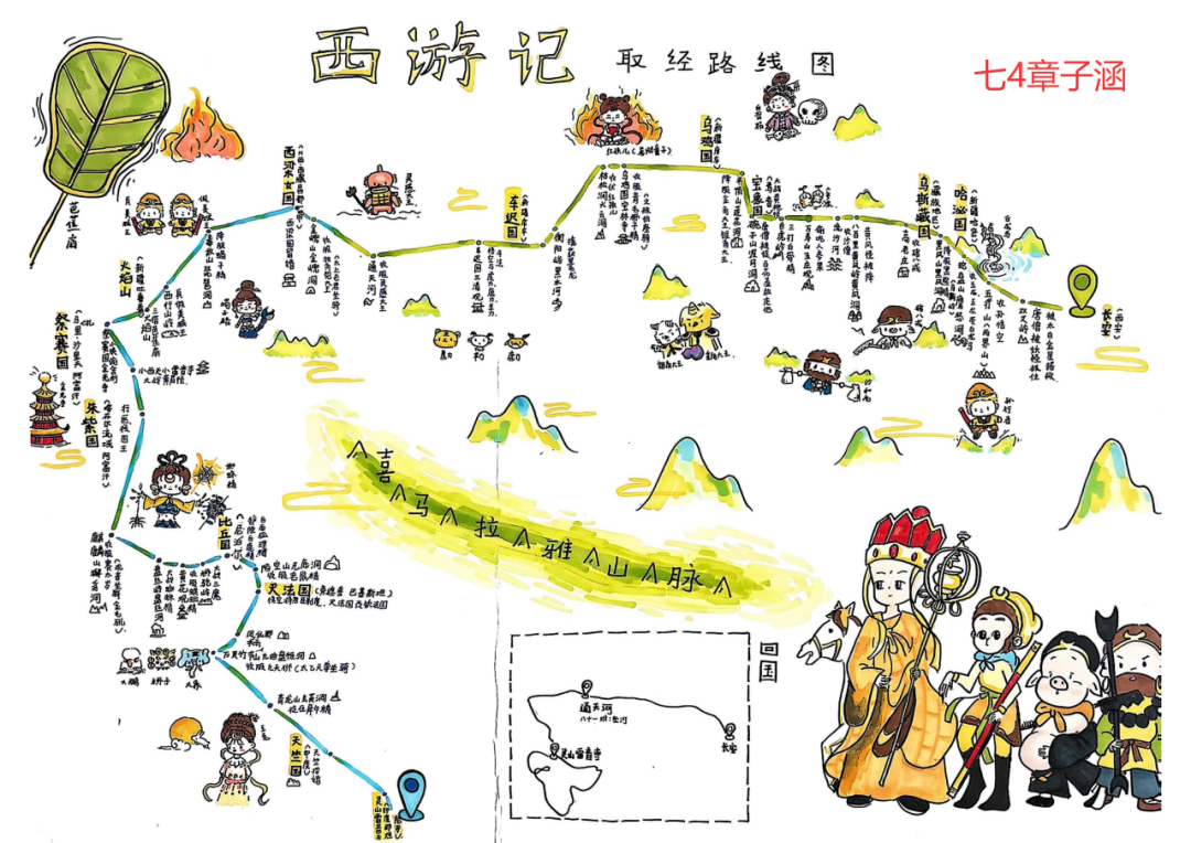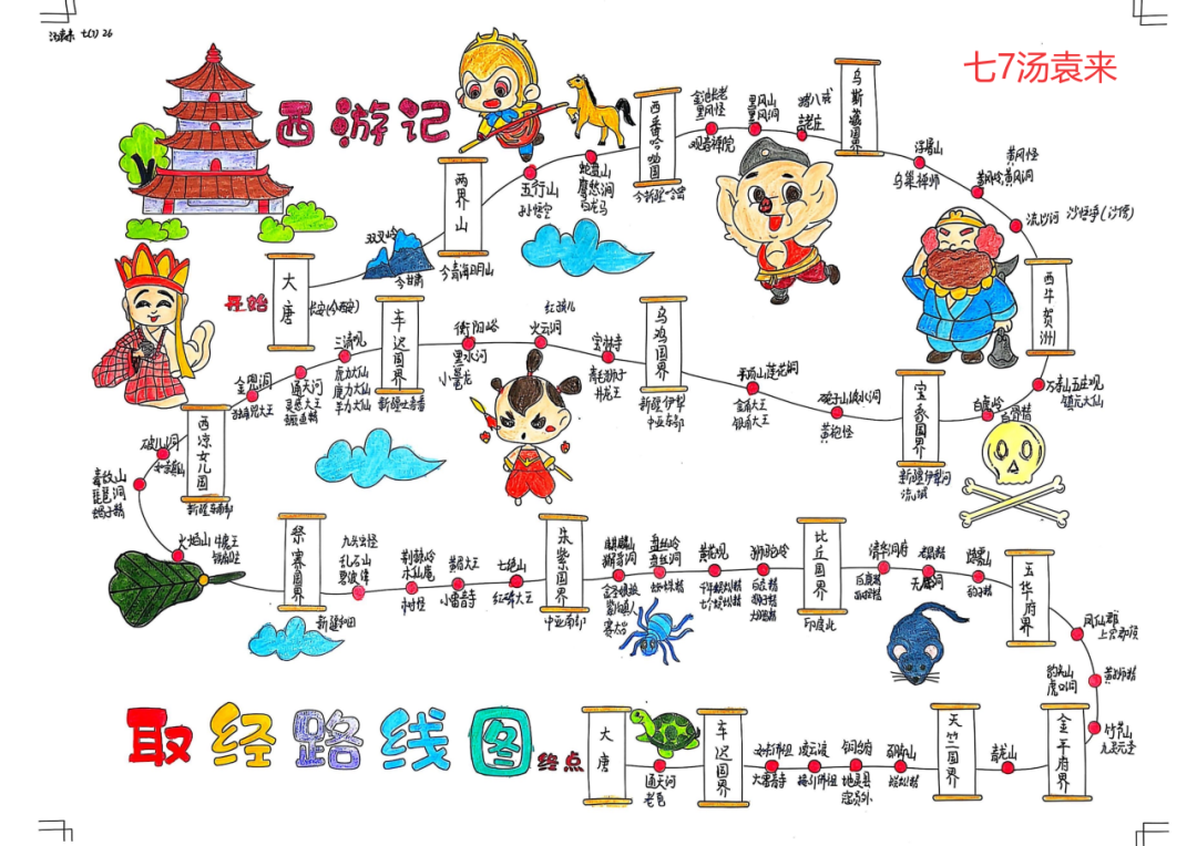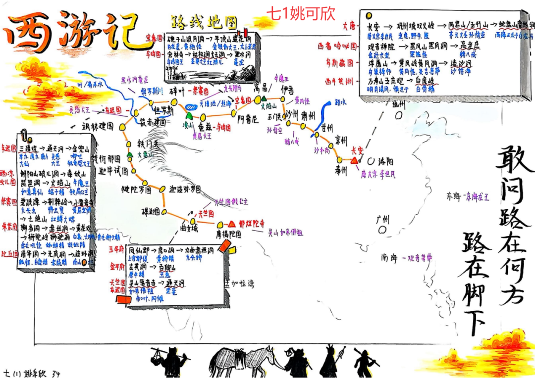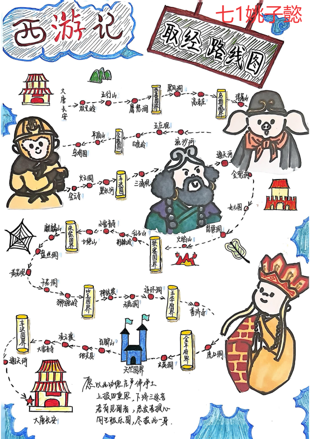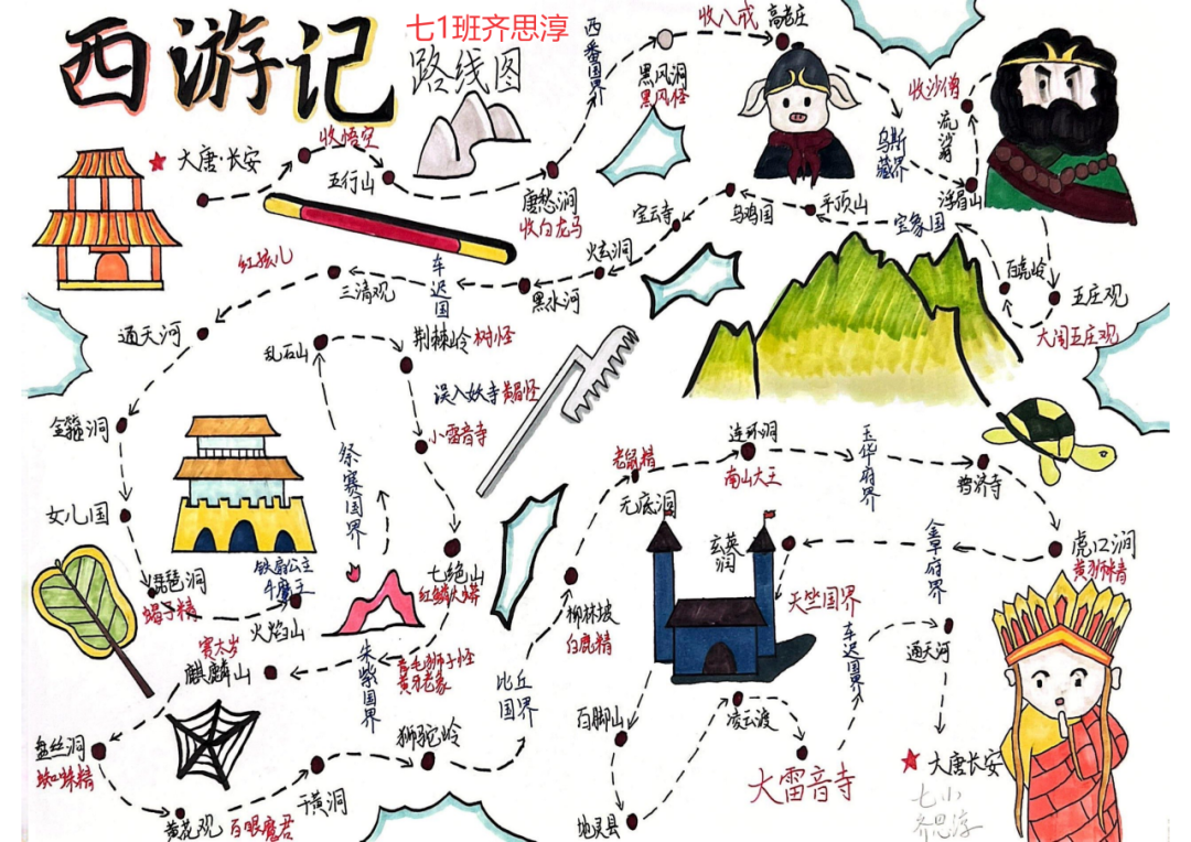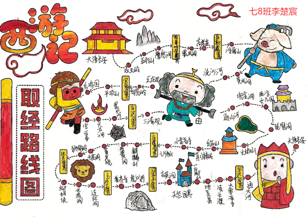 “绘西游,走征途,悟真经” 西游记取经路线创意“绘制园” 这个暑假,同学们潜心品读《西游记》原著,融汇地理知识与文学想象,以笔为舟,以心为帆,穿梭于神话与现实交织的西行长路。无论是细腻的文字还是精巧的绘图,每一幅作品不仅是路径的再现,更是个体与经典对话的见证。 一点一线,勾勒的是九九八十一难的坎坷与坚定; 一色一彩,渲染的是火焰山、流沙河、通天河的奇幻与磅礴; 一笔一画,标注的是信念的方向与修行的轨迹。 这些作品,既是对取经之路的重溯,也是对成长之路的隐喻:唯有历经跋涉,才得真经;唯有亲手绘制,才知天地宽阔。现在,就让我们一同走进这些充满灵思与悟性的创意绘图,见证经典如何在少年笔端,重生绽放。 作品展示: 七(1)班 齐思淳 七(1)班 姚乐欣 七(4)班 章子涵 七(7)班 汤袁来 七(8)班 李楚宸 七(1)班 姚子懿