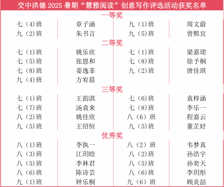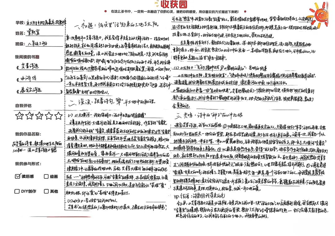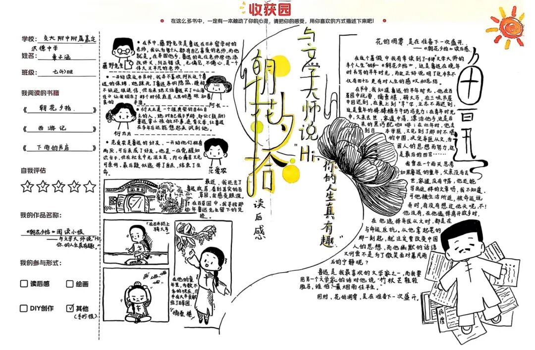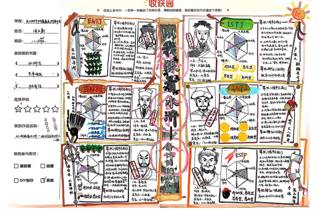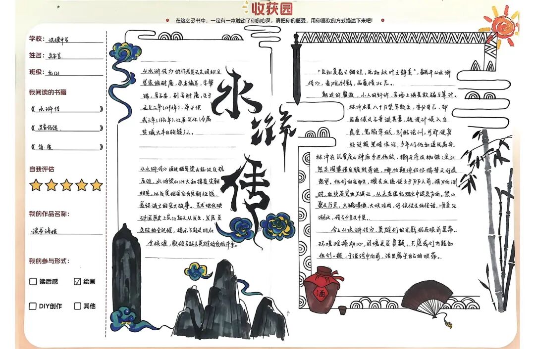 “慧阅读,雅写作,创未来” 慧雅阅读创意写作“收获园” 在这场与文字深交的旅程中,同学们择其所爱,潜入书页之间,以笔墨为舟,驶向思想的深邃与广袤。或抒怀于笔墨,或寄情于丹青,同学们以读后感、绘画、DIY创作、思维导图等多元形式,诠释阅读的收获。每一笔落下,都是与自我、与世界的诚恳对话。 字字斟酌,是理性与情感的交融; 段段锤炼,是意象与哲思的碰撞; 篇篇完成,更是灵魂的独白与成长的印记。 这些作品,既是阅读之光的折射,也是写作之美的生发;是少年心事的安放,亦是未来创造的初声。现在,请您静心品读,走进这片兼具智慧与雅意的文字森林,聆听那些发自心灵深处却回声悠长的表达。 作品展示: 九(2)班 朱书言 九(1)班 周文蔚 七(4)班 章子涵 九(5)班 曾熙宜 墨香启迪心灵,书声涵养学子。一笔一世界,一字一乾坤。这个暑假,交中洪德的学子们以书为舟、笔为桨,在文海遨游探索,寻觅真知,积淀性灵。这是充满欢笑与收获的旅程,每次阅读是播种智慧星火,每次写作是思维绽放光芒。愿学子们保持对文字的热忱,勤读善思,让好书为伴,书香滋养初心,阅读照亮成长路,青春不负笔墨下的奔赴。愿这段书香之旅未来延续,永放光芒。