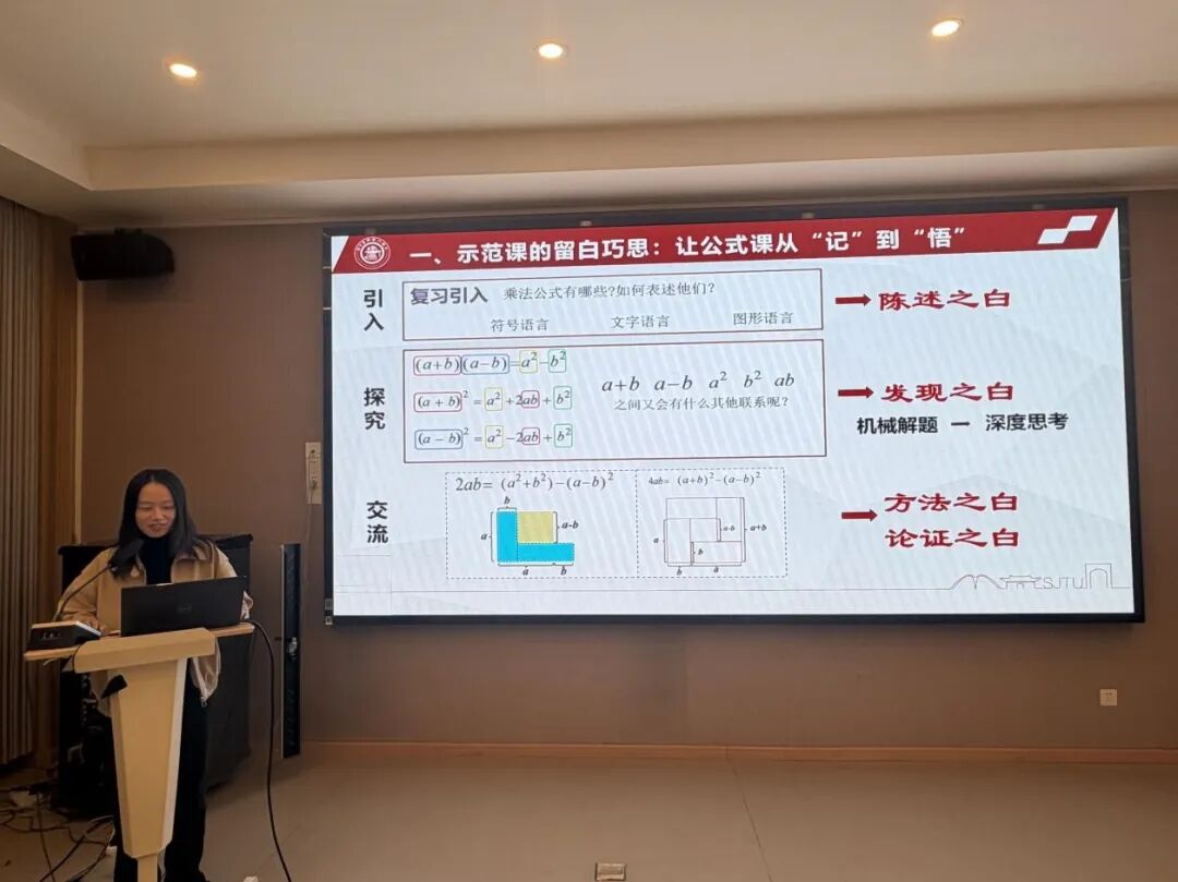 两位教师分别从理论建构与教学实践双维度系统阐释“留白创造式教学”的内涵与价值,为全校教师呈现了一场融合理论思辨与实践智慧的专业盛宴。 1 姚峥一老师分享 姚峥一老师以“从‘填鸭式灌输’到‘留白式生长’——数学教学的范式转型”开始,梳理了该教学模式的理论根基与实践逻辑。他指出,传统“讲练导学式”教学易导致学生思维僵化,而留白创造式教学以建构主义、再创造理论为核心,通过突破单向课堂结构、突破机械学习方式以及突破知识本位目标,指向学生数学思维与核心素养培育。继而,姚老师从陈述之白、发现之白等六个维度,结合乘法公式、配方法等案例,阐明如何通过精准设计将课堂转化为学生主动建构知识的“思维实验室”。 2 杜珍珍老师分享 杜珍珍老师则从利用“课例+课题”的形式分享其从理论认知到课堂生长的实操经验。在《乘法公式》示范课例中,她剖析了通过“陈述之白”“发现之白”“超越之白”的设计,让课堂从“知识灌输场”转变为“思维碰撞场”的实践巧思;在配方法教学课题中,她构建了“问题驱动—自主探究—反思迁移”的教学链,结合情境创设、知识迁移、文化渗透等环节,展现留白教学的进阶路径。