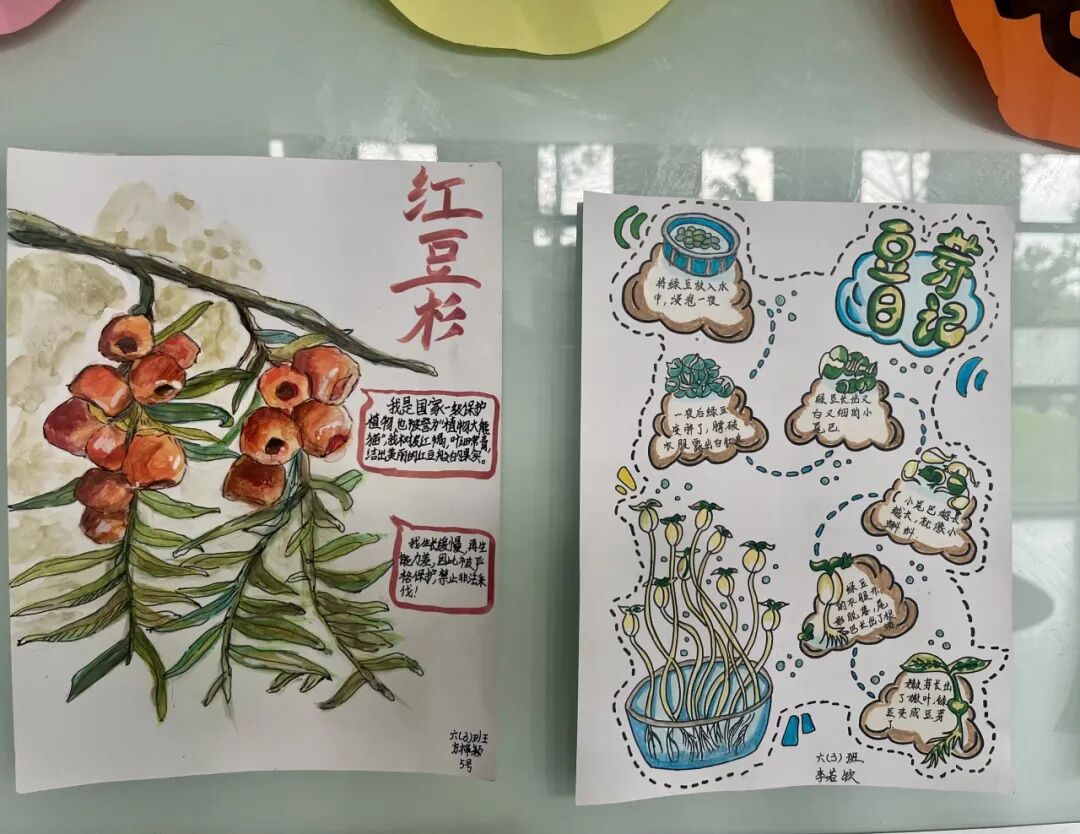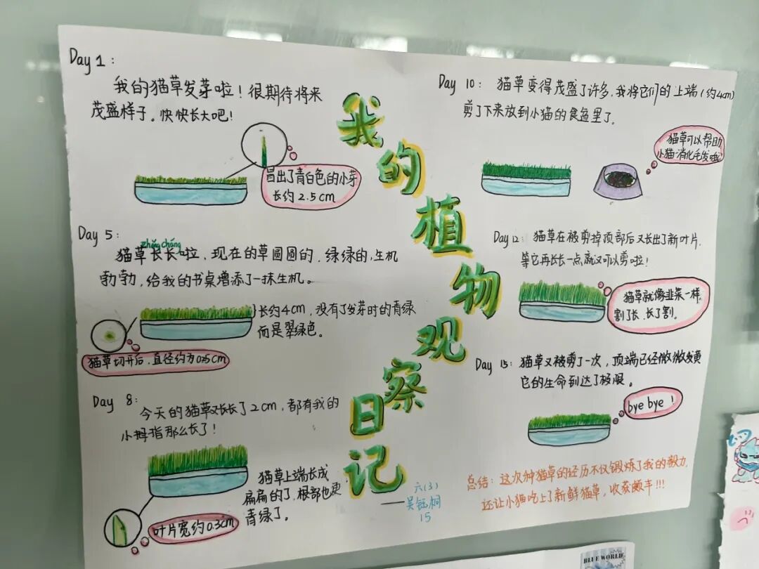 成于实践 以观察日记铭刻成长 “实践名片”——自然观察笔记,汇集了一批洋溢着生活气息的学生佳作。同学们化身为“自然观察员”,将视线聚焦于校园与日常生活中的寻常事物,以细腻的视角捕捉自然界的细微美好。无论是文字描述、手绘插图,还是照片粘贴,同学们以多样化的形式记录下这些自然细节,字里行间洋溢着对身边事物的好奇与热忱。 精选出的佳作在图书馆专栏集中展出,成为校园中一道亮丽的风景。这份独特的“自然答卷”,不仅展现了学生们格物致知的观察力,更成为他们探索自然、记录成长的宝贵见证。