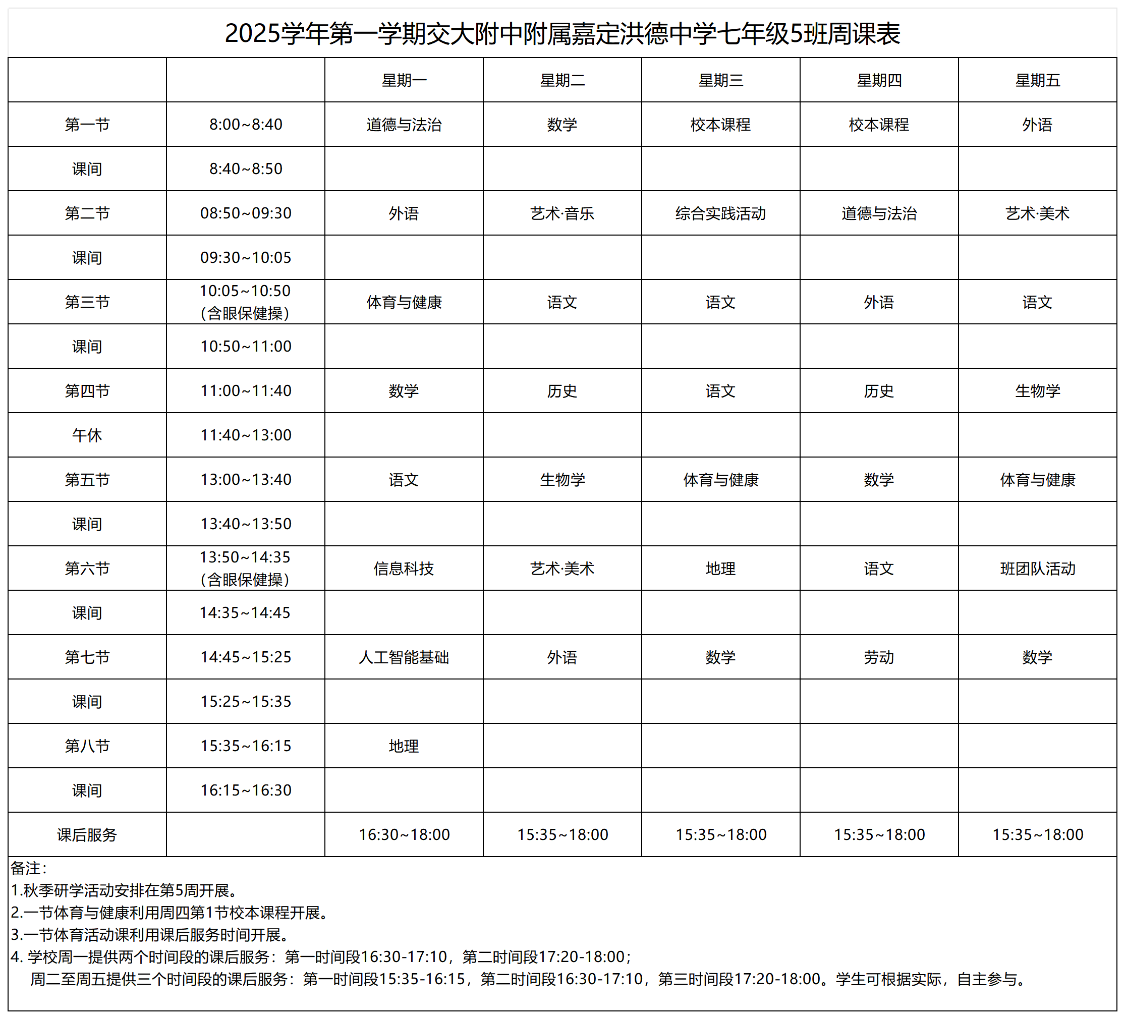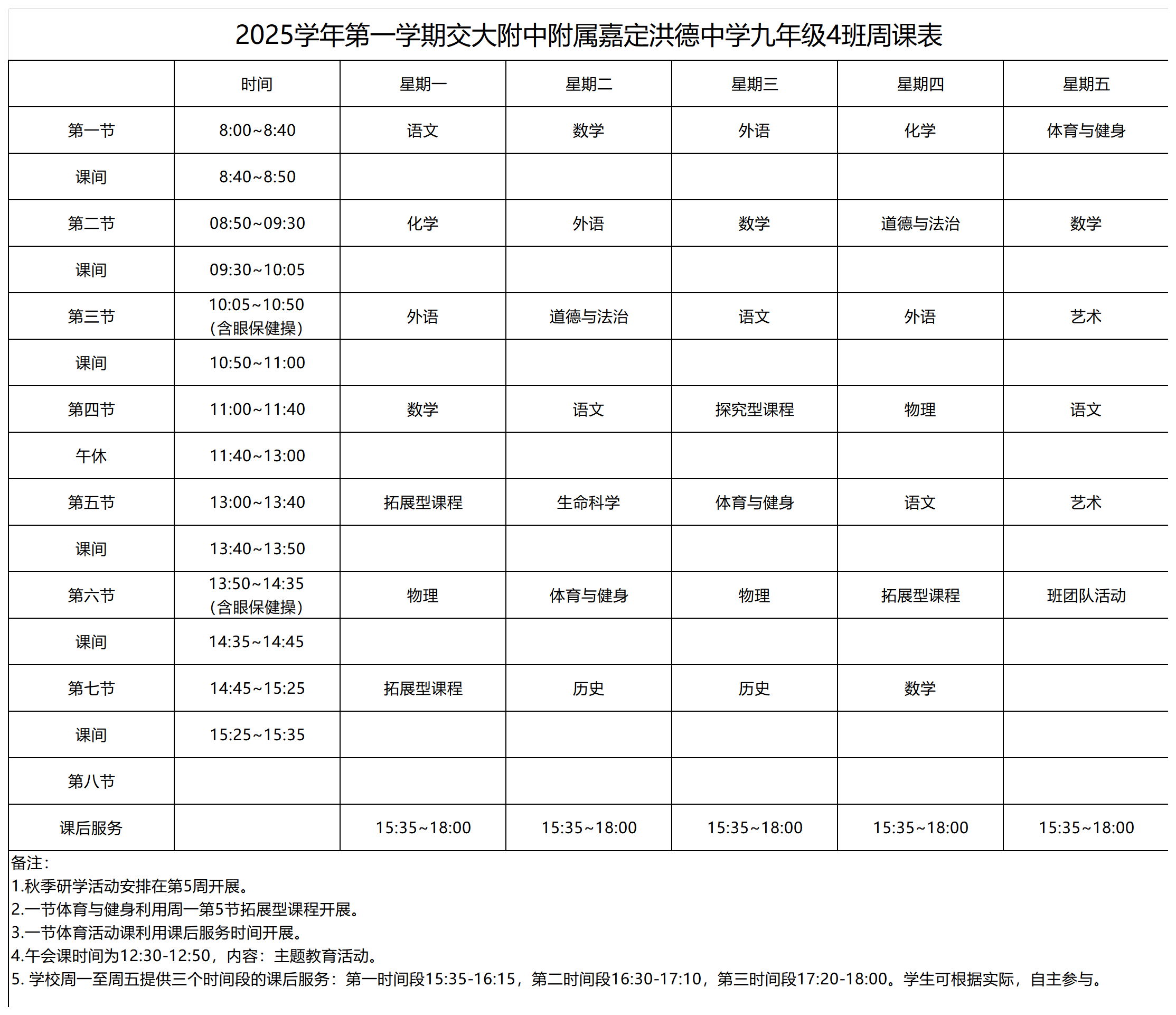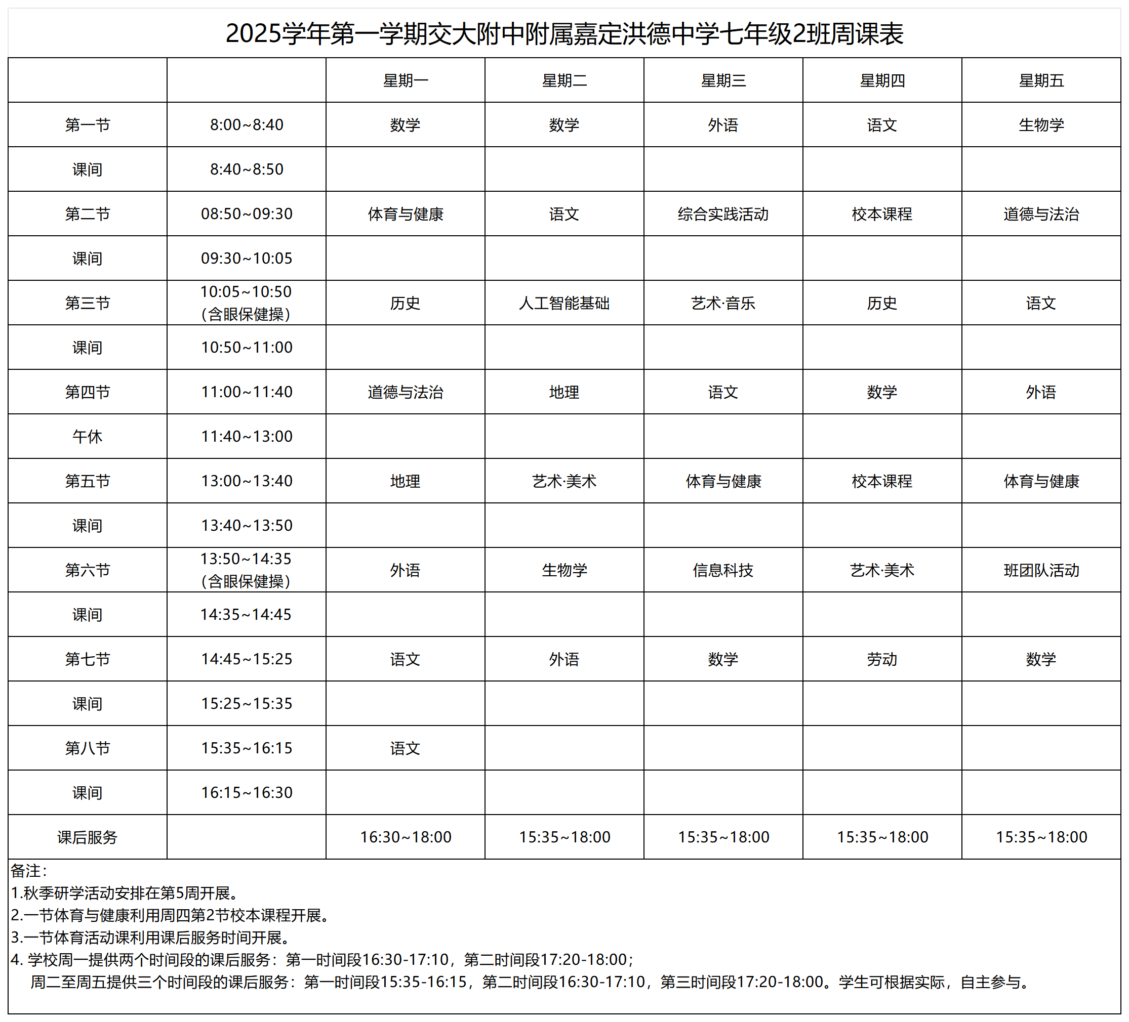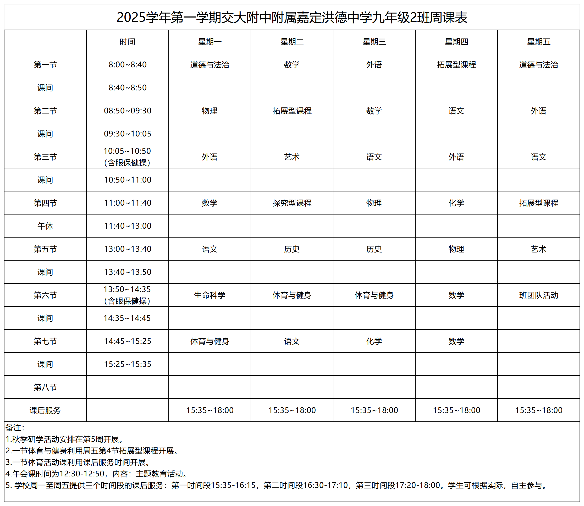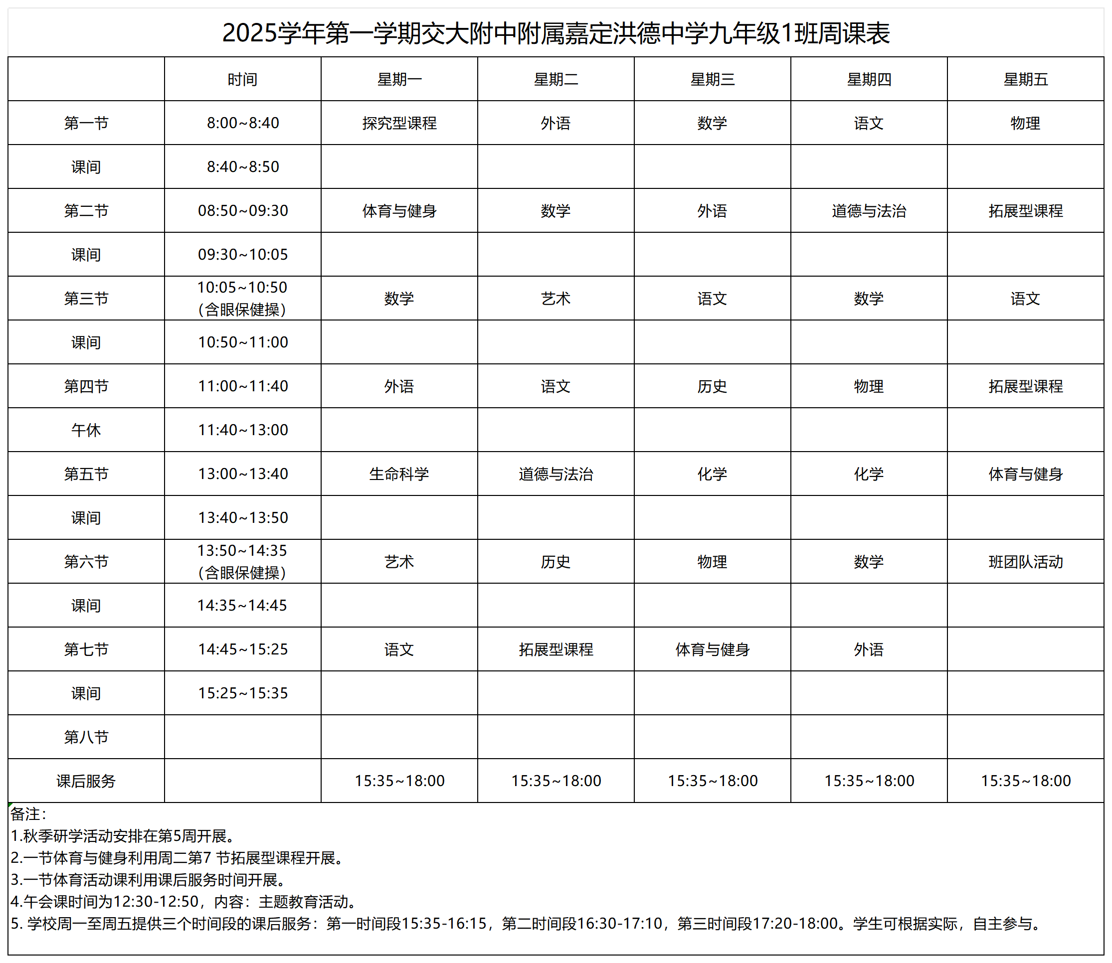 2025学年第一学期交大附中附属嘉定洪德中学周课表