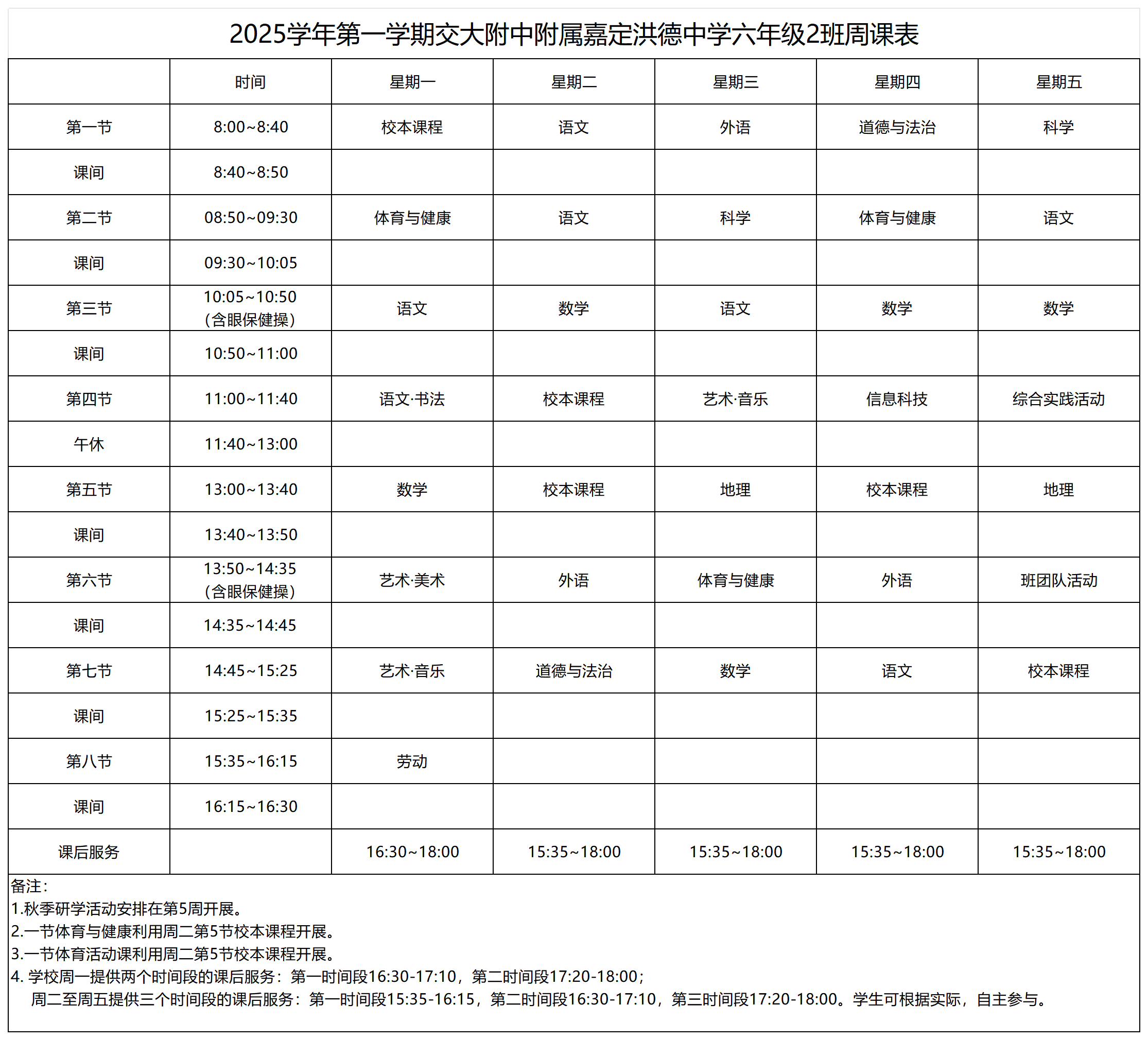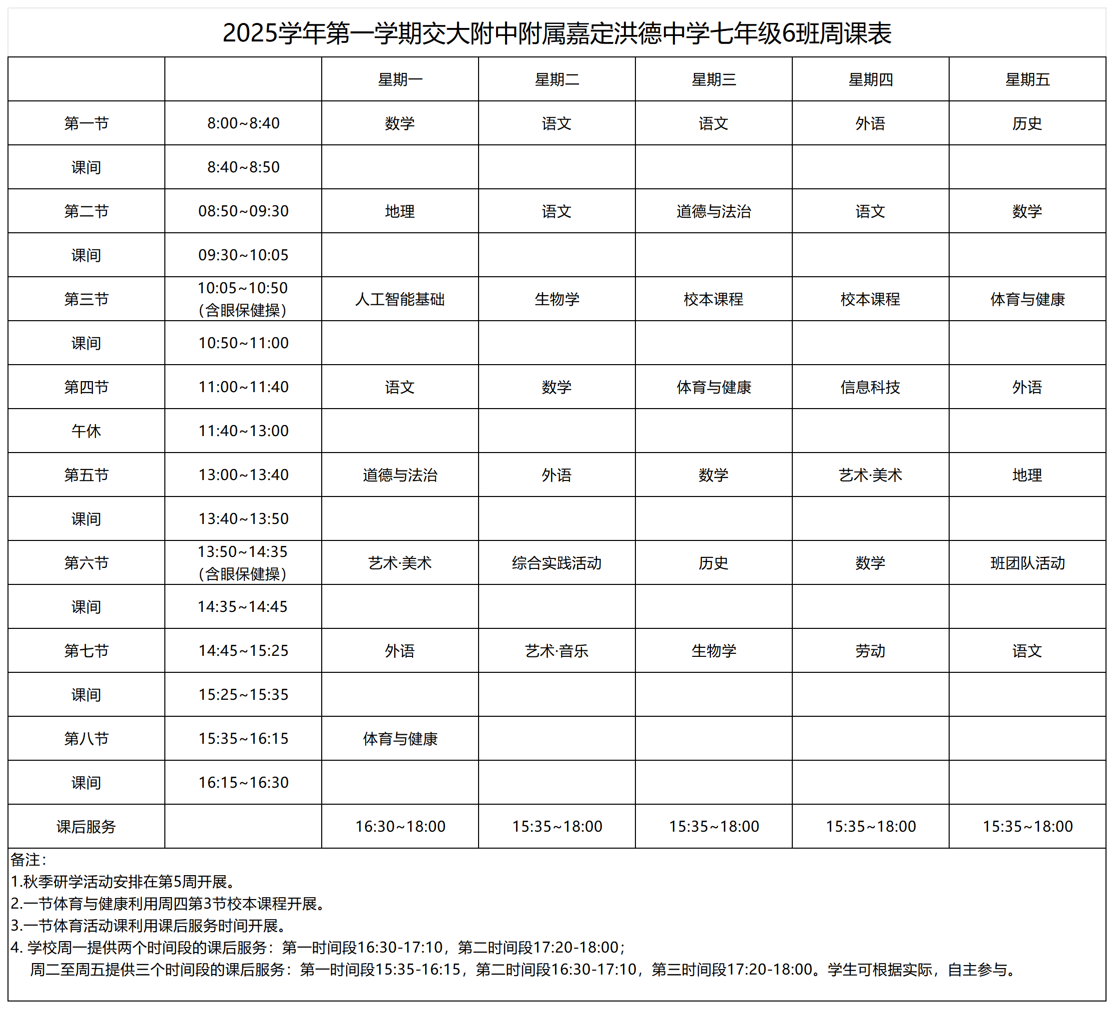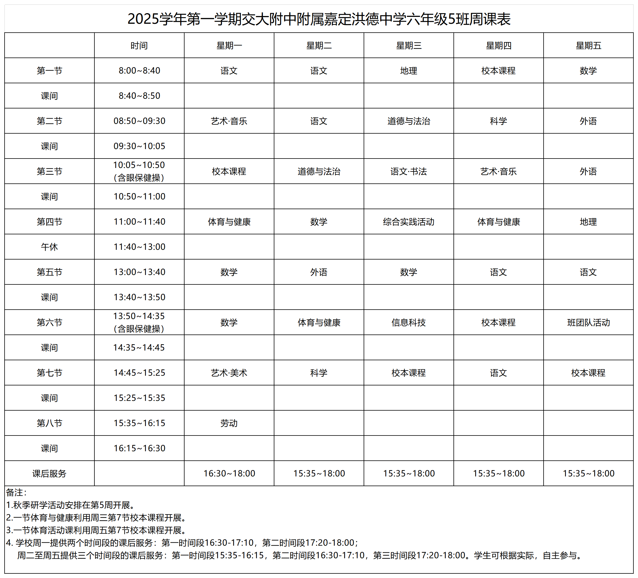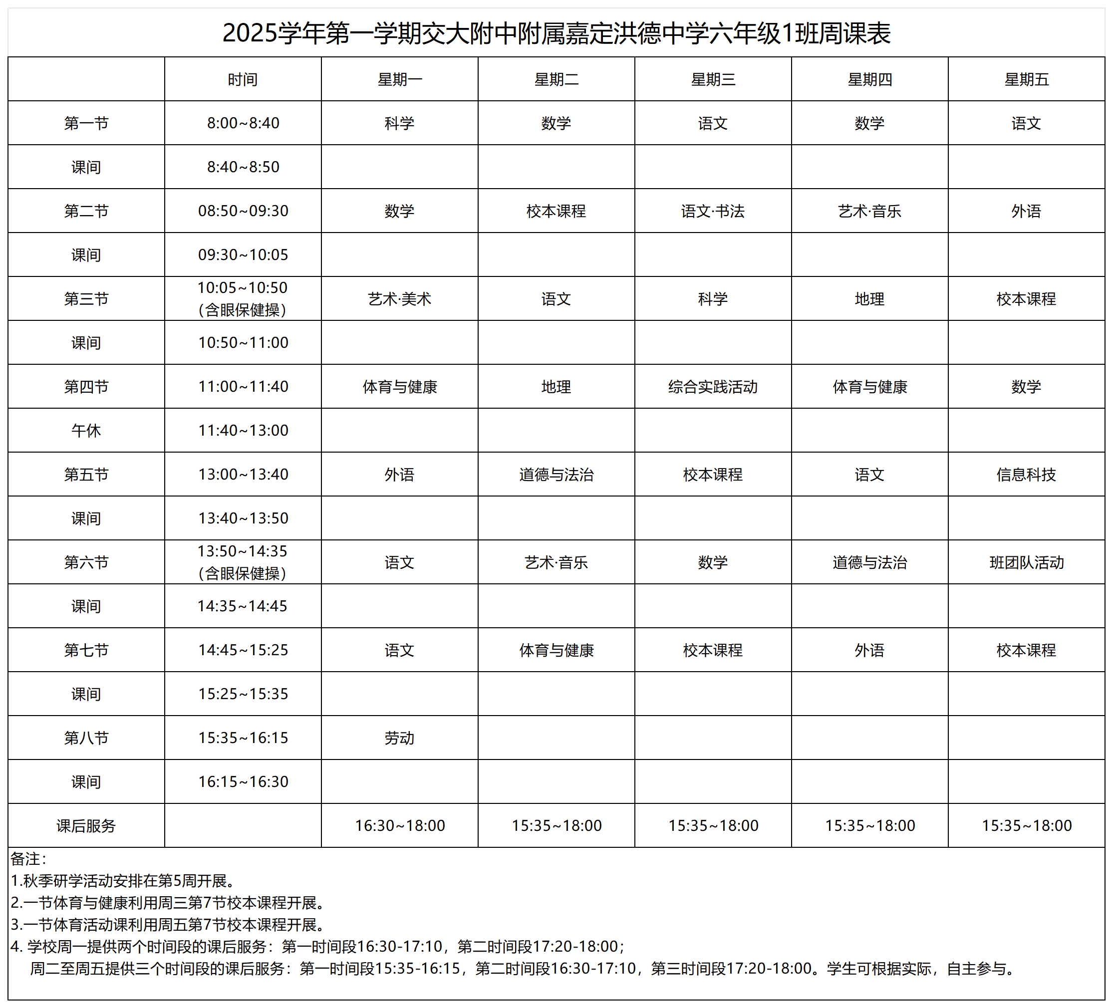 2025学年第一学期交大附中附属嘉定洪德中学周课表