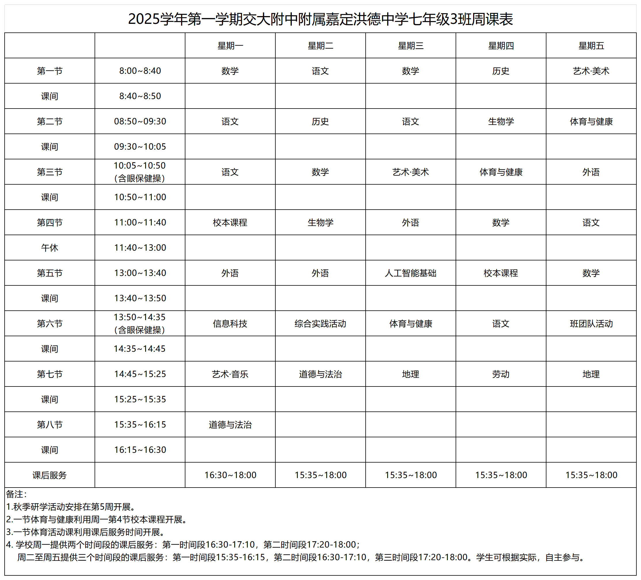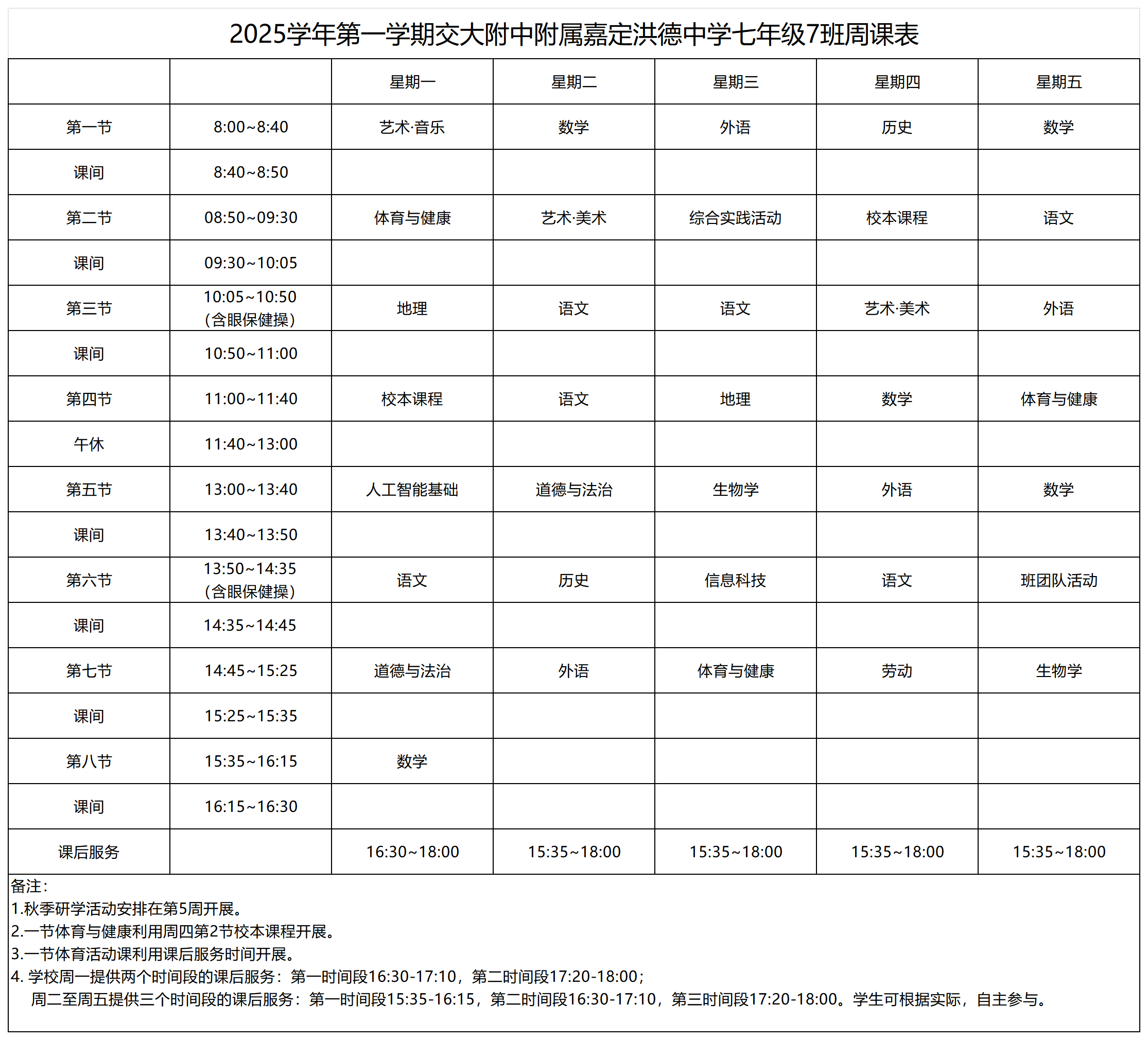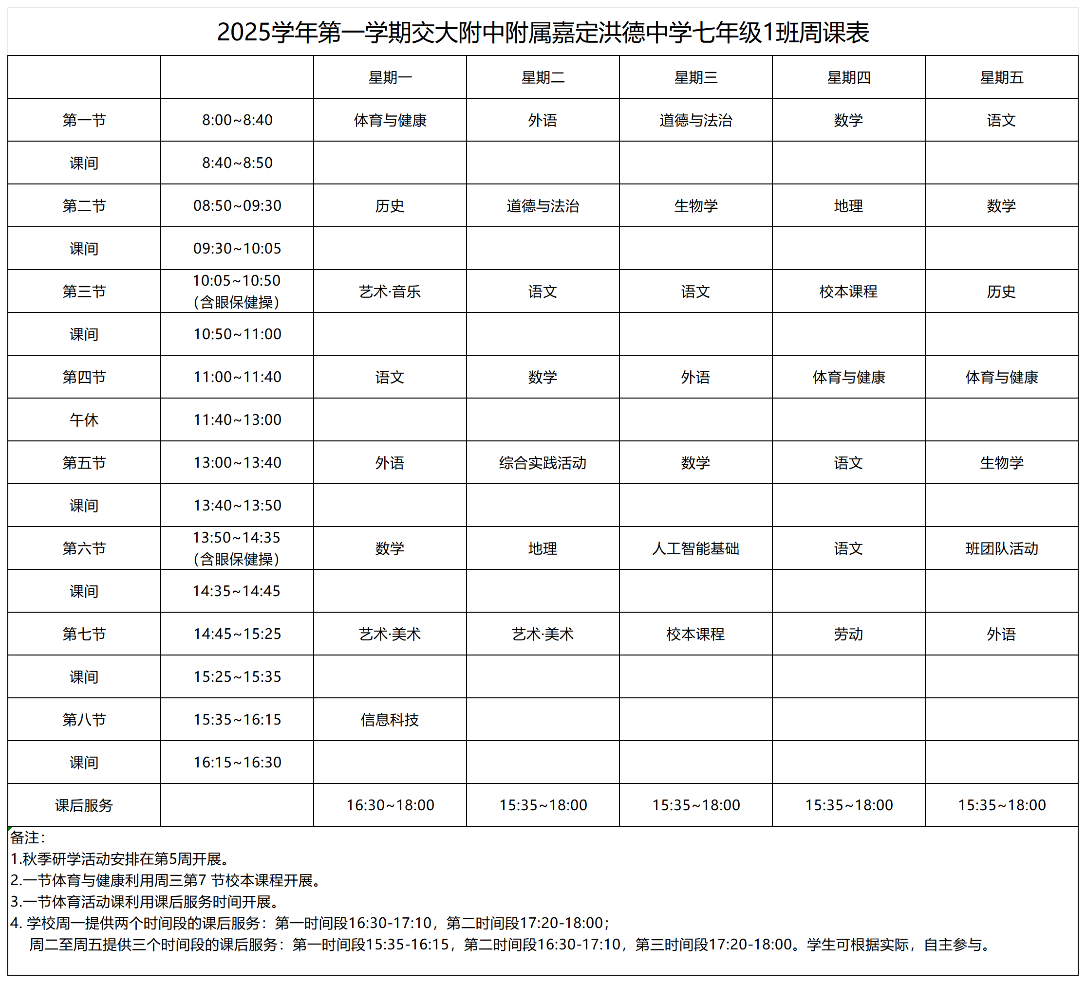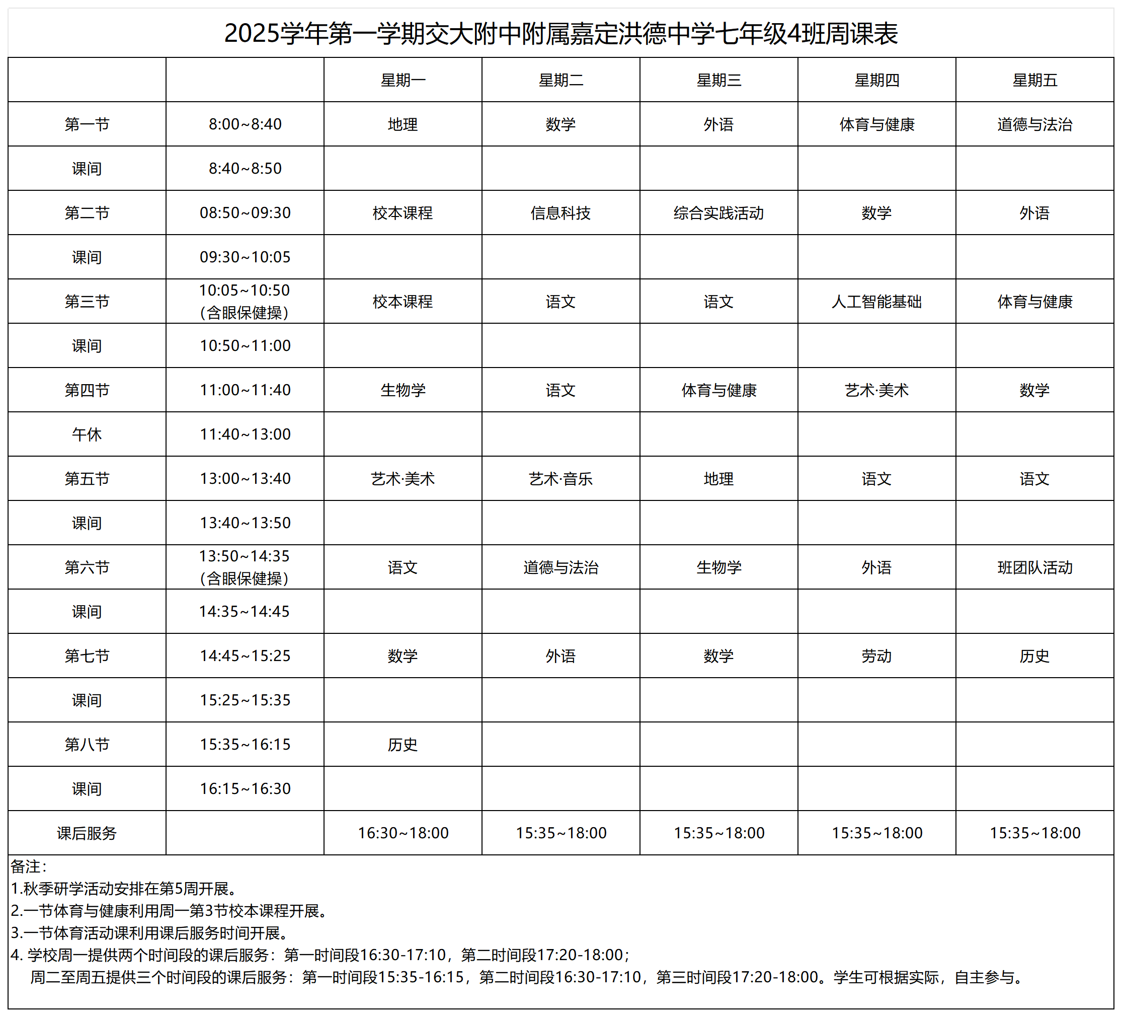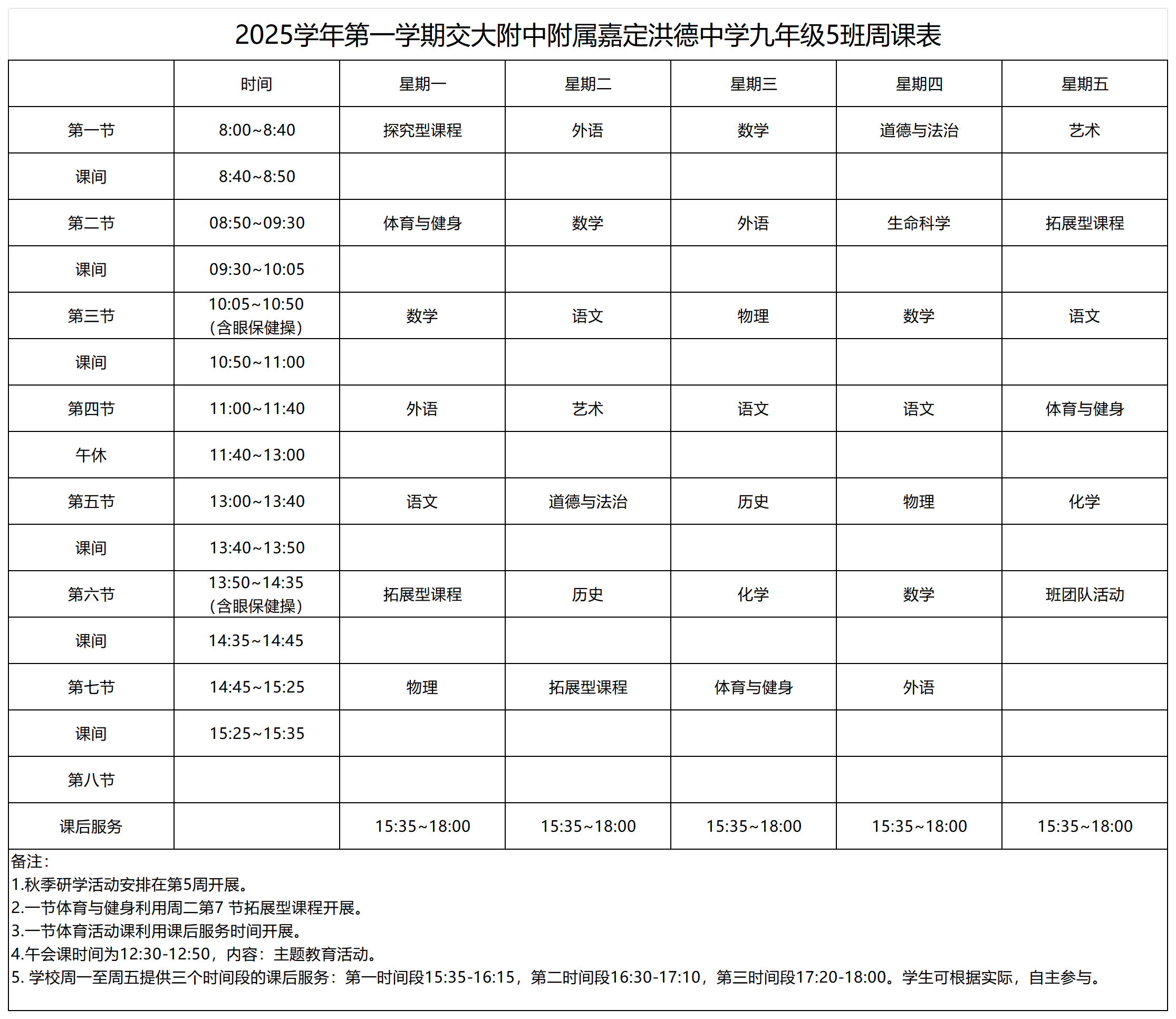 2025学年第一学期交大附中附属嘉定洪德中学周课表