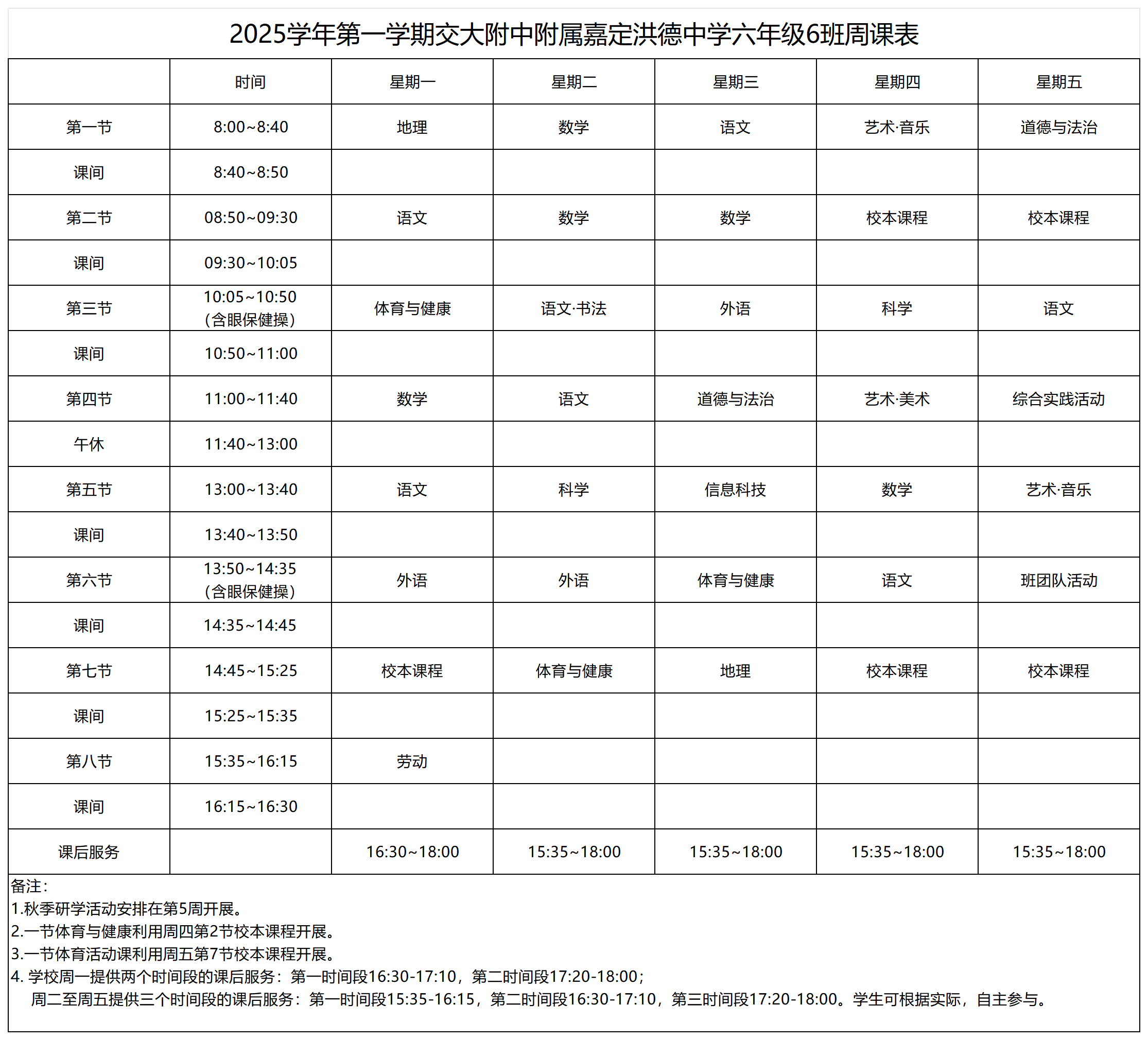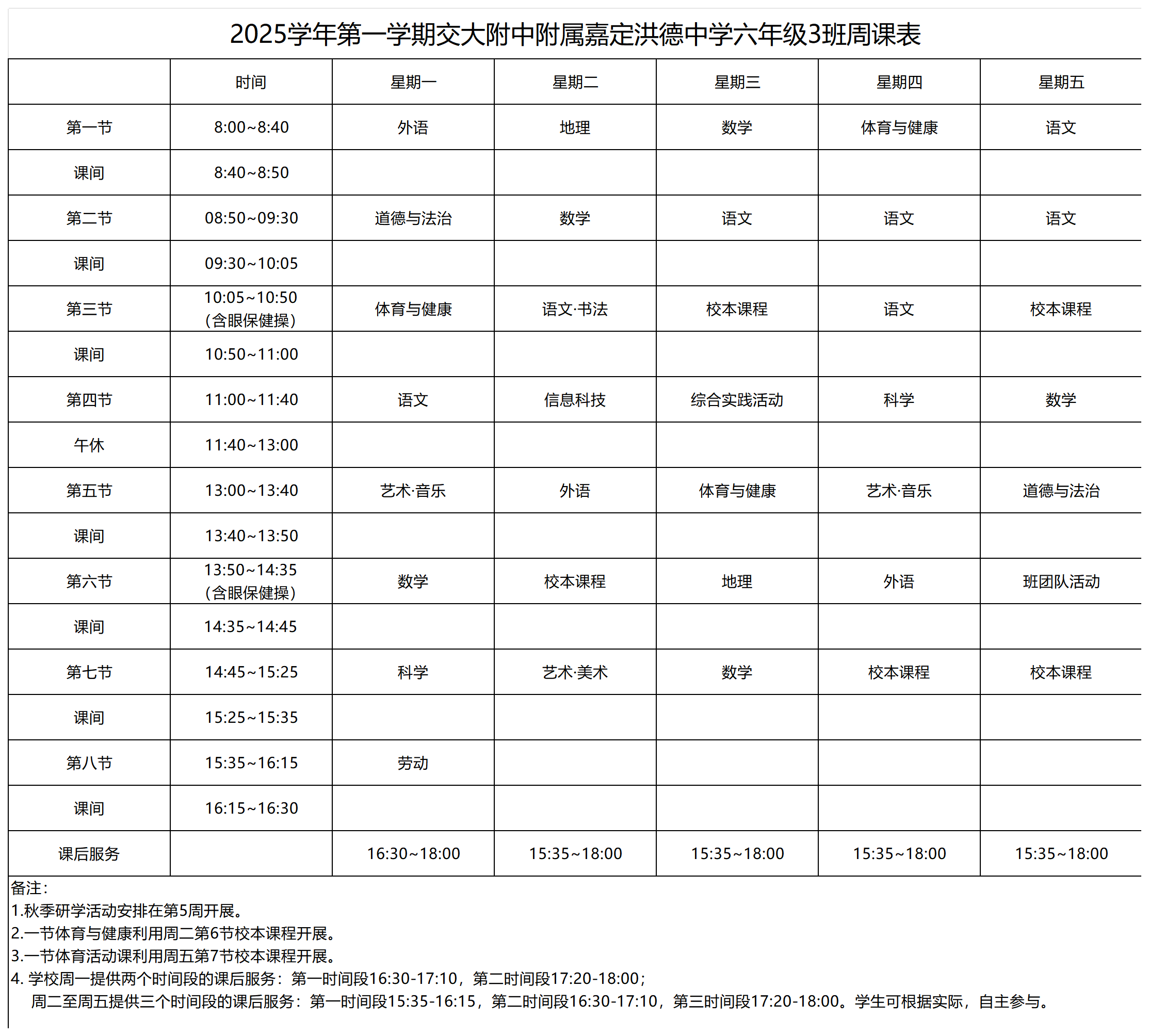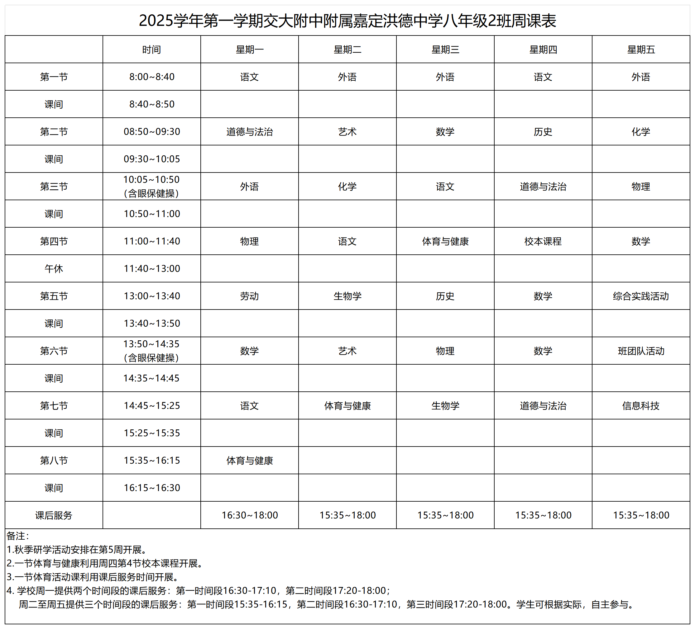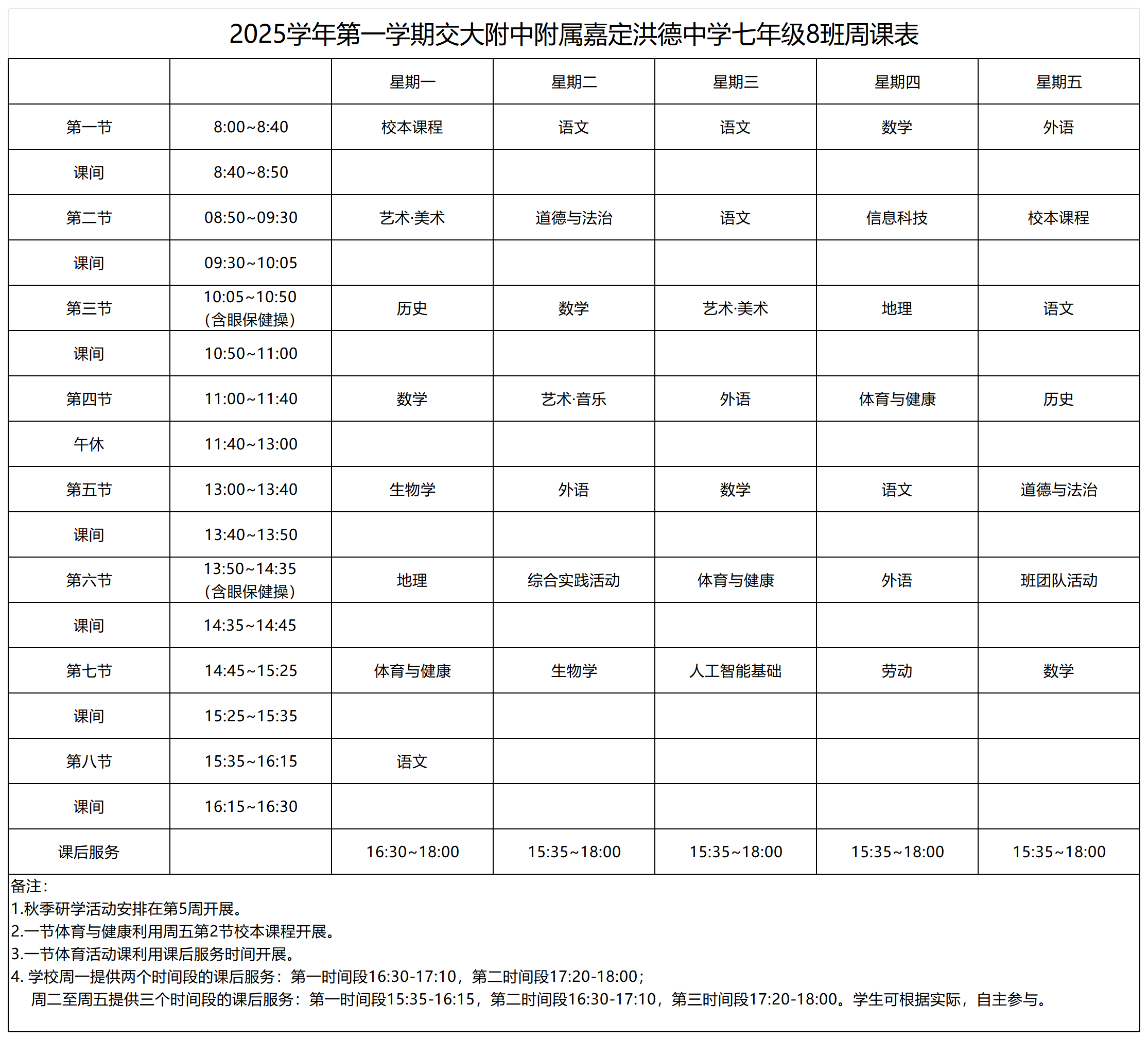2025学年第一学期交大附中附属嘉定洪德中学周课表