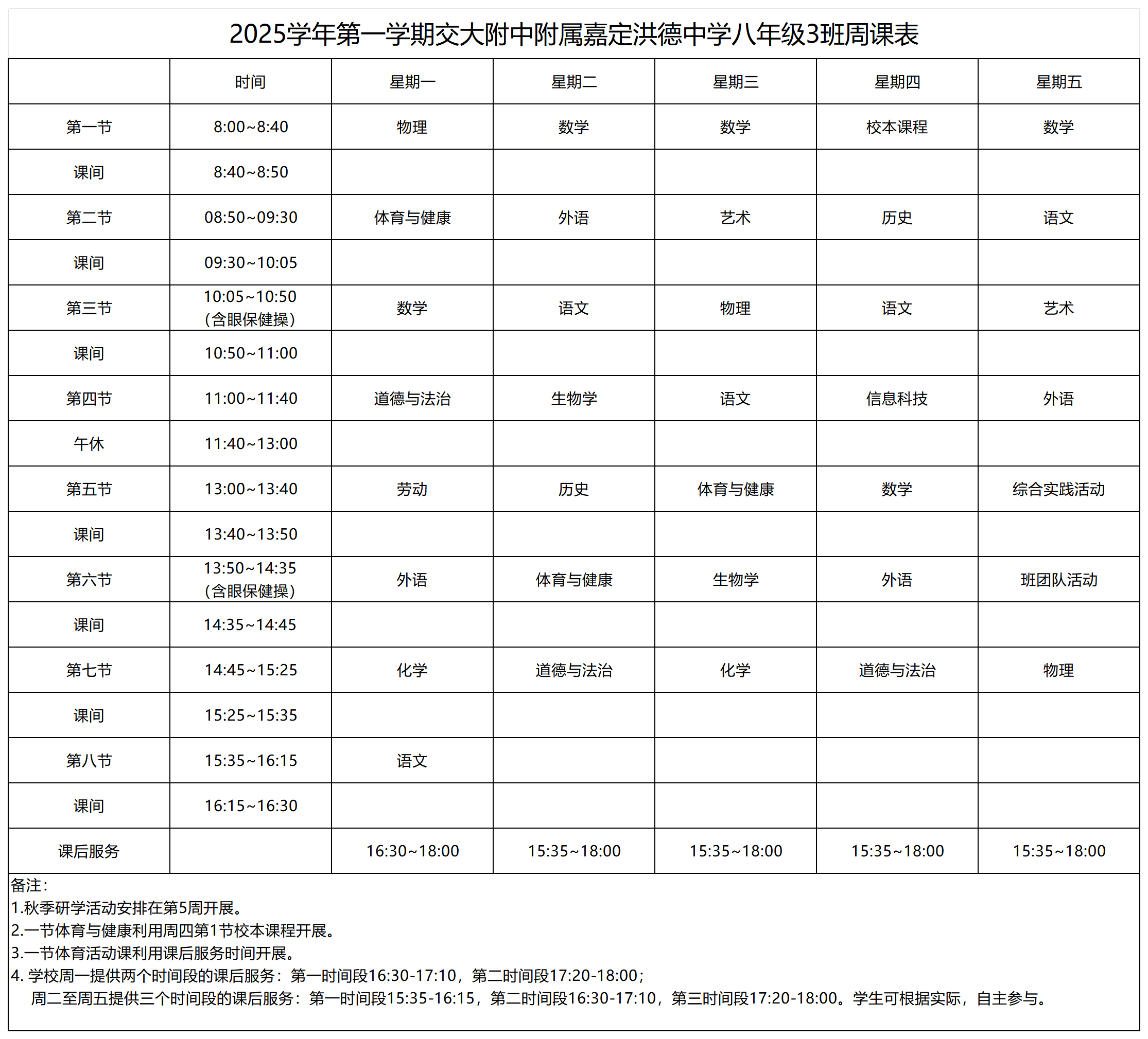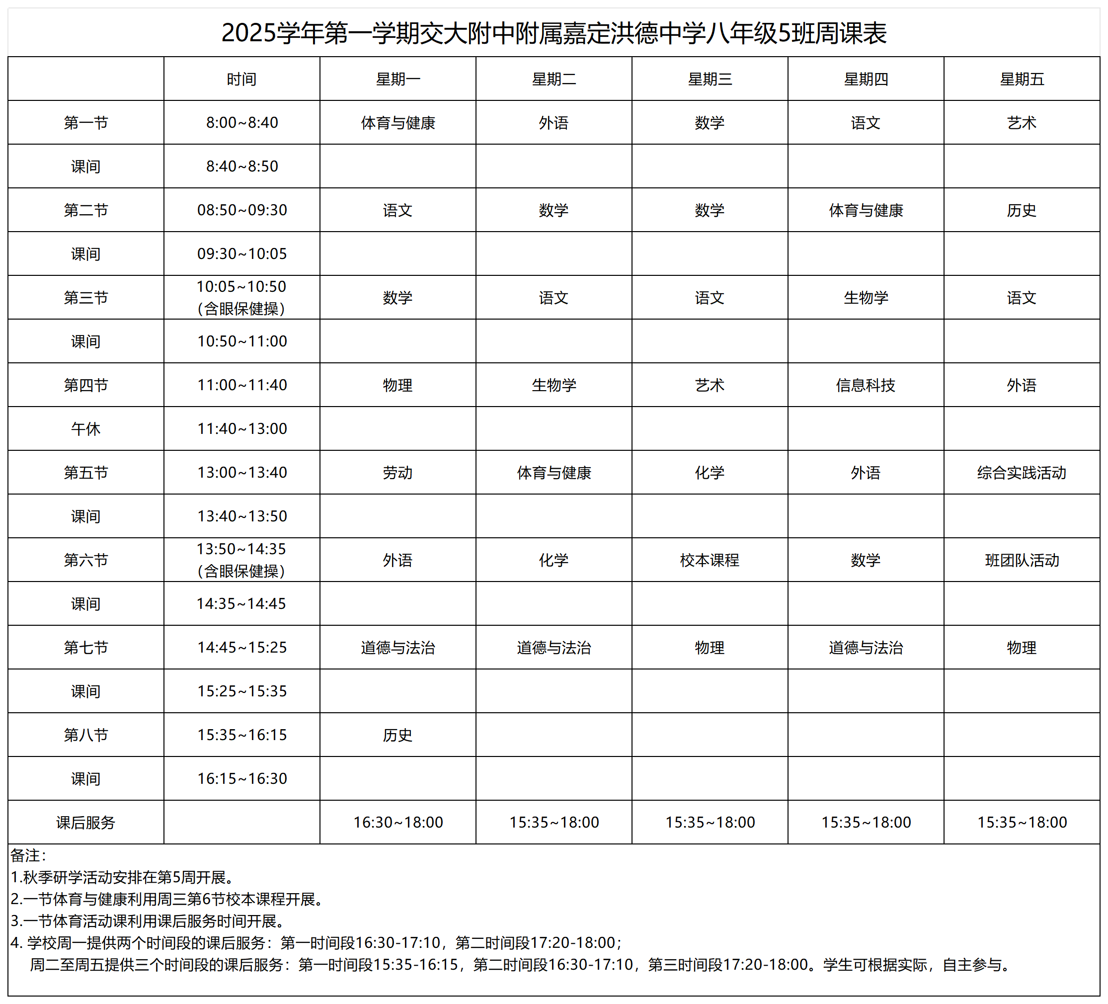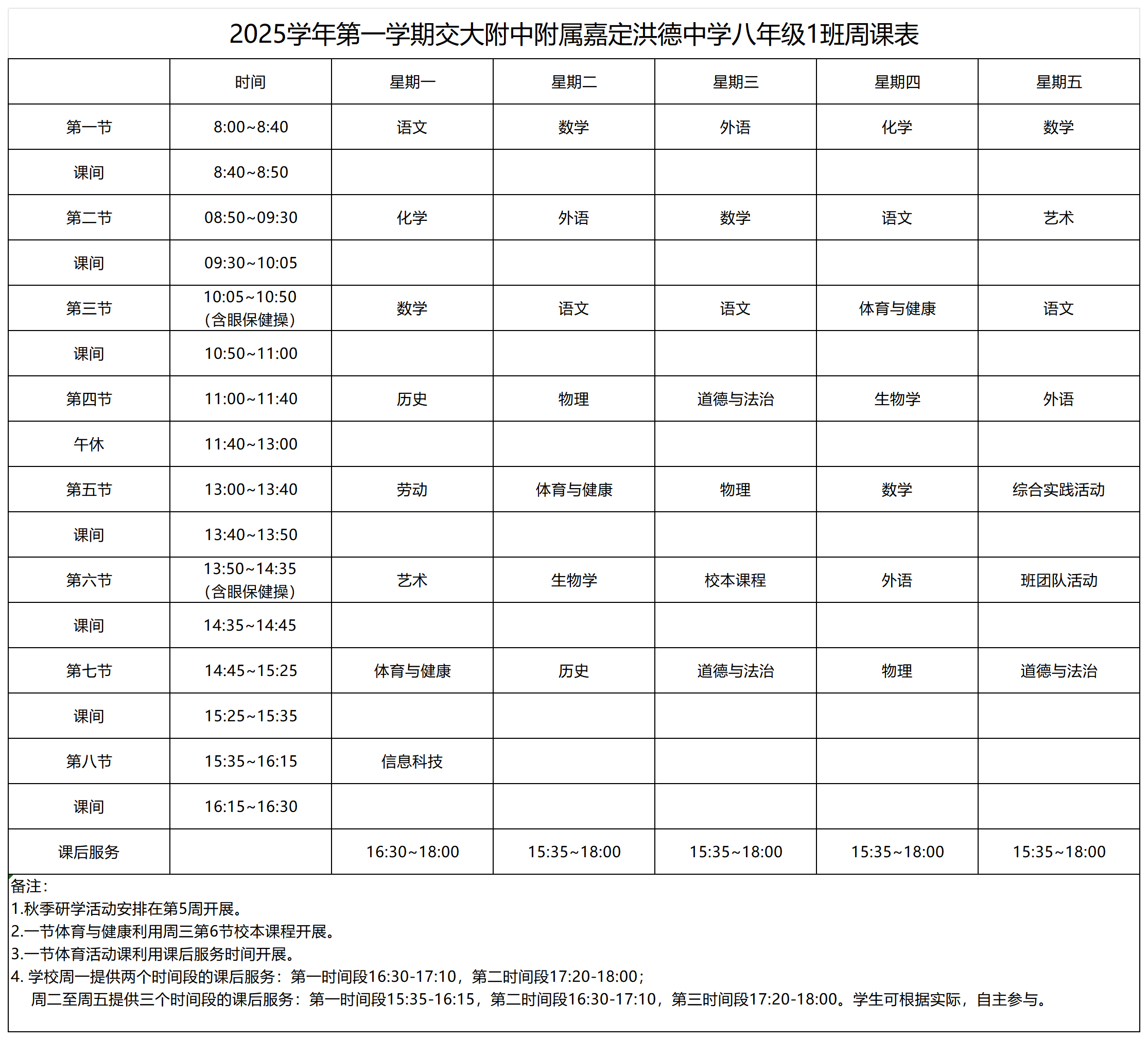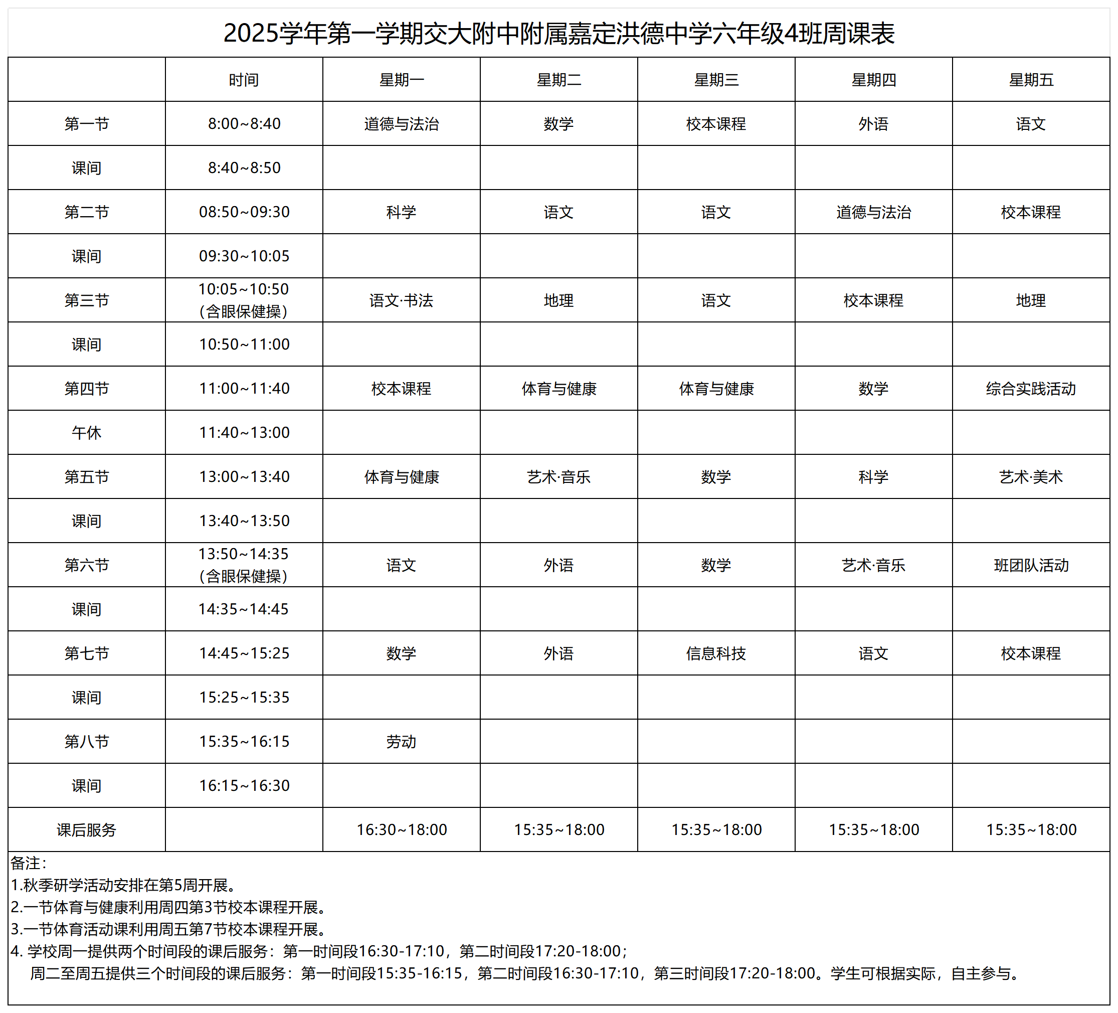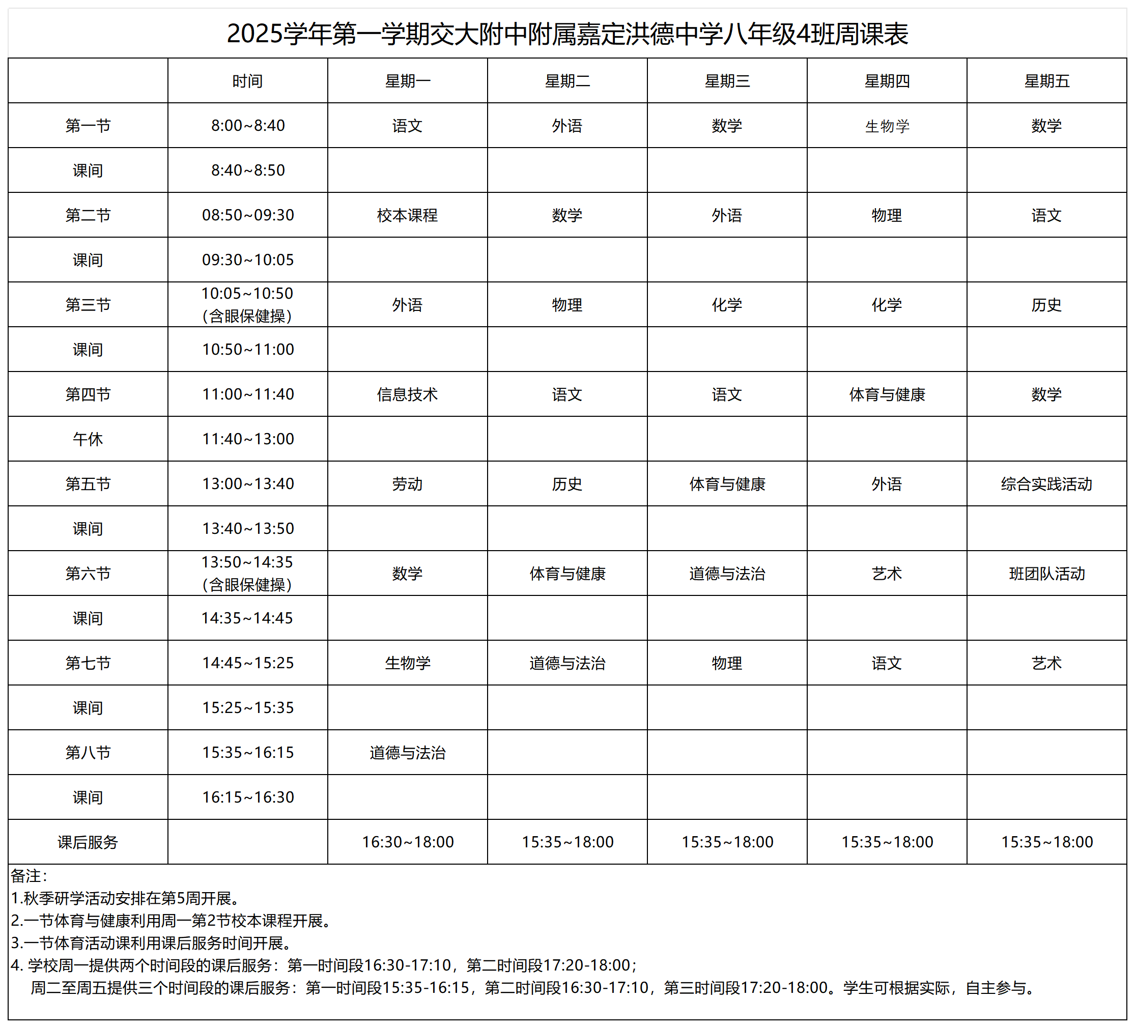 2025学年第一学期交大附中附属嘉定洪德中学周课表